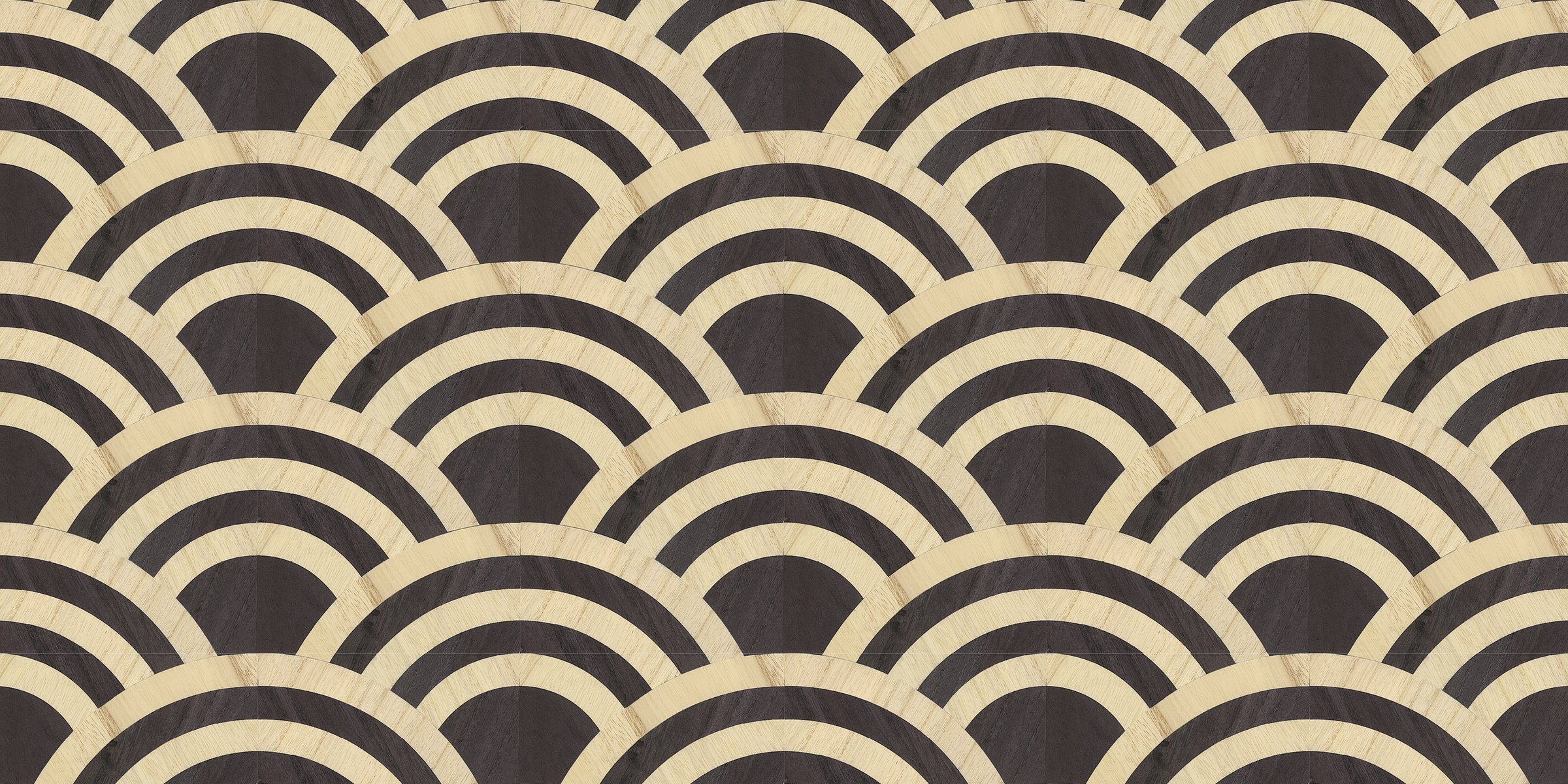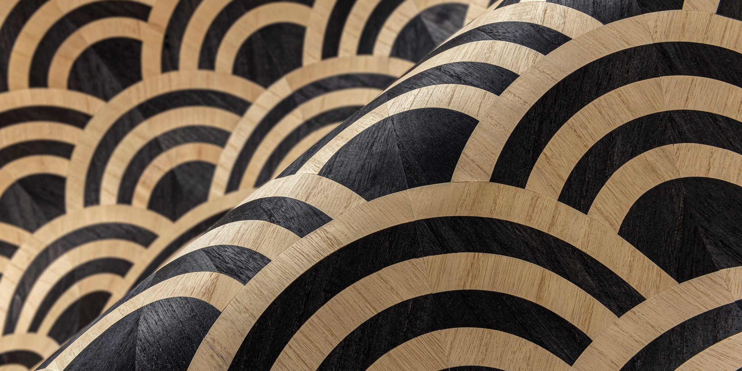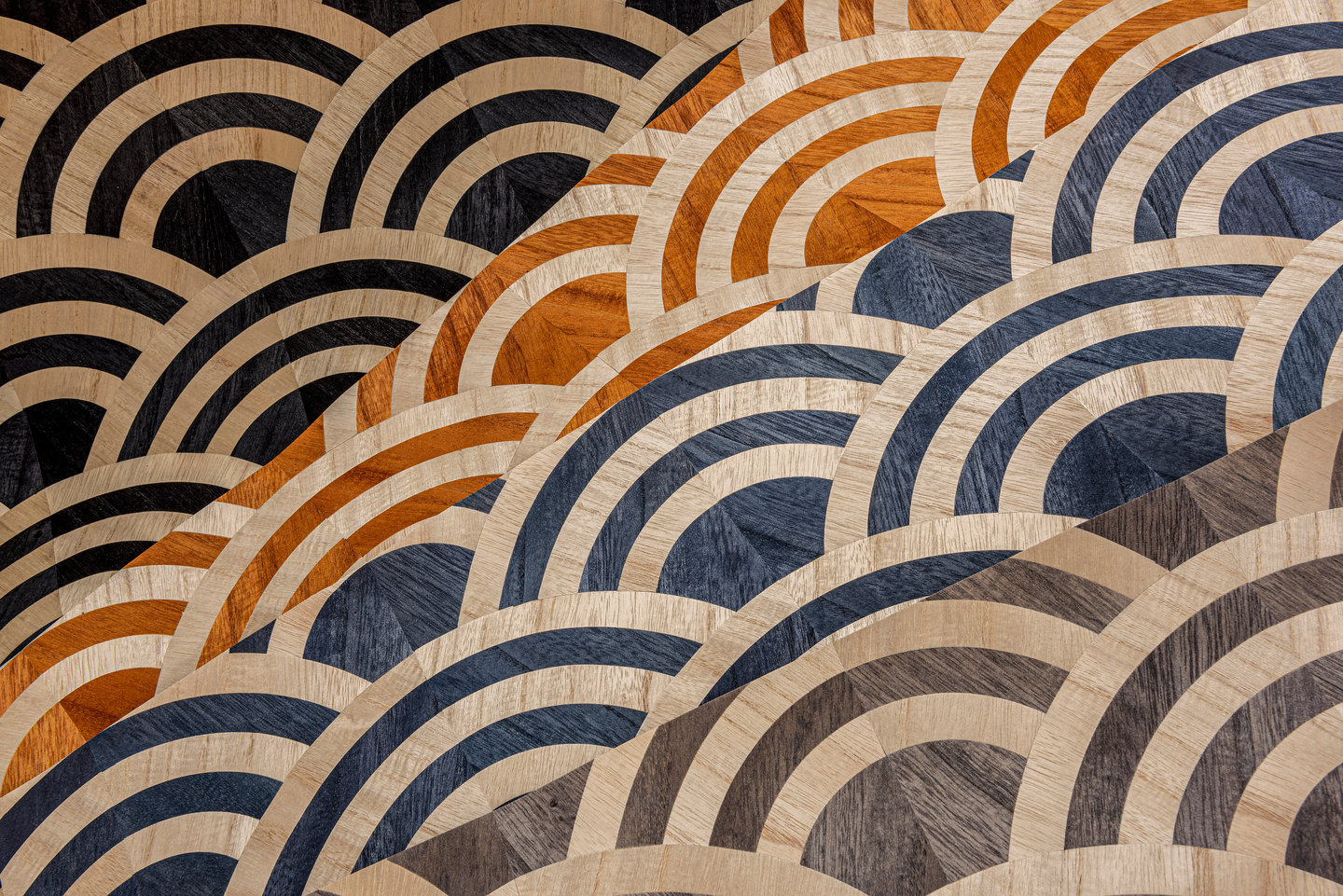 重叠的 O, 由木贴面镶嵌物创建, 类似于海洋的滚动波。独特的壁墙覆盖的古代西盖哈图案象征着水波,代表着好运、力量和韧性。
