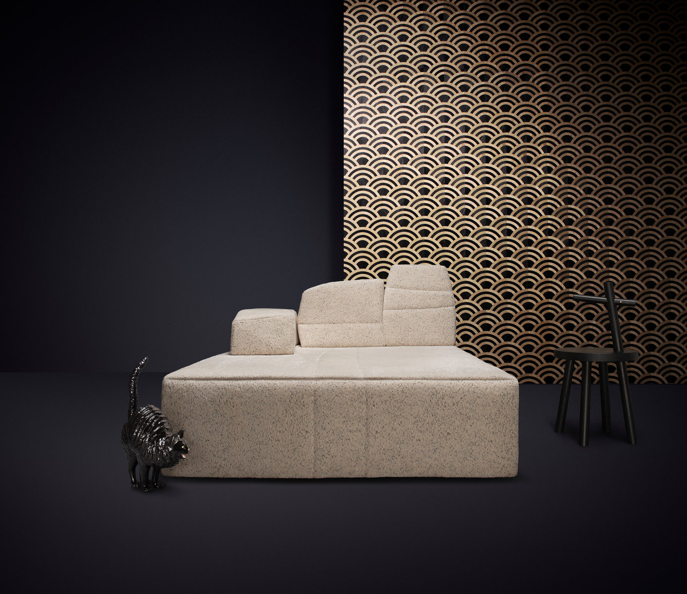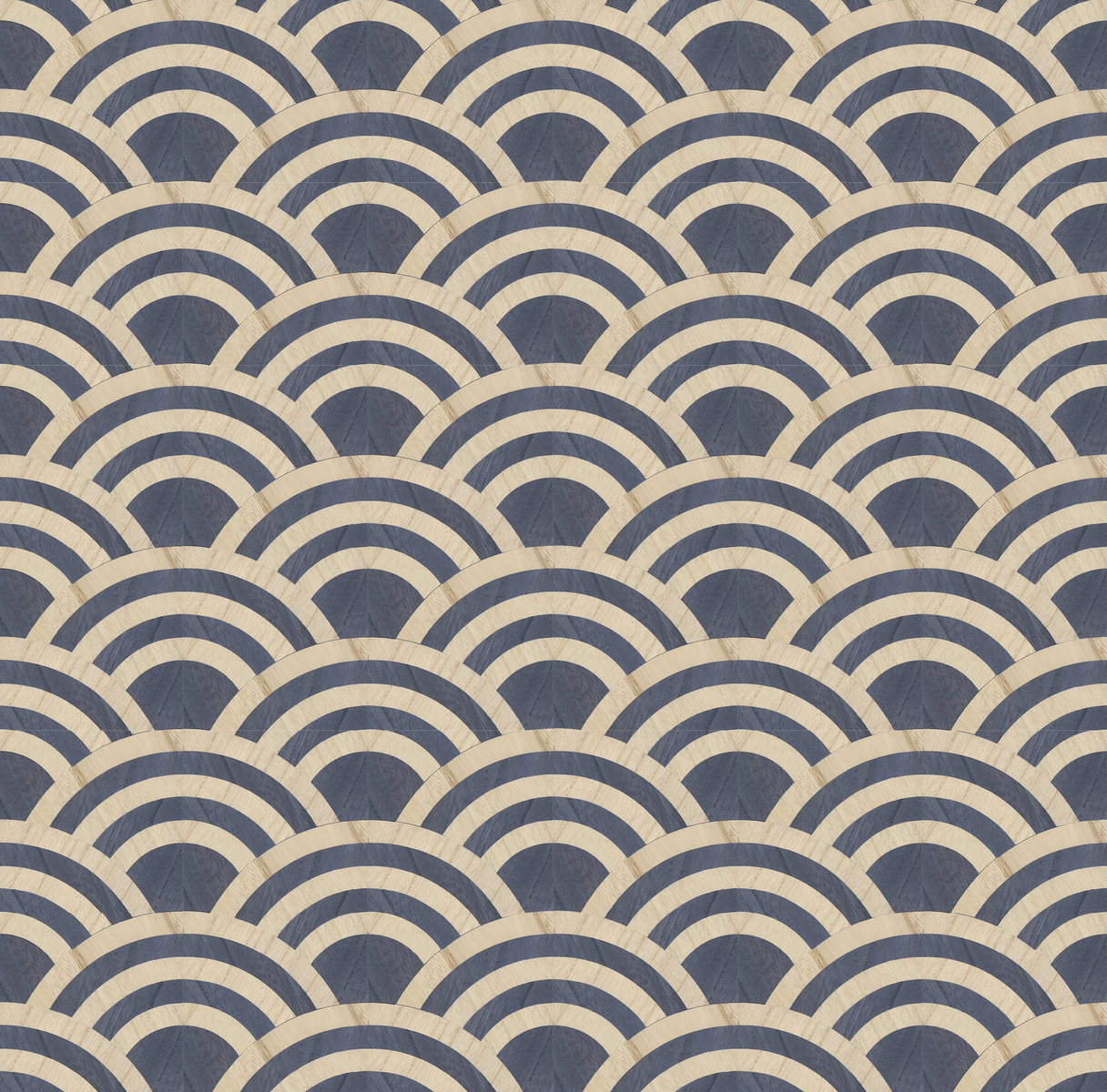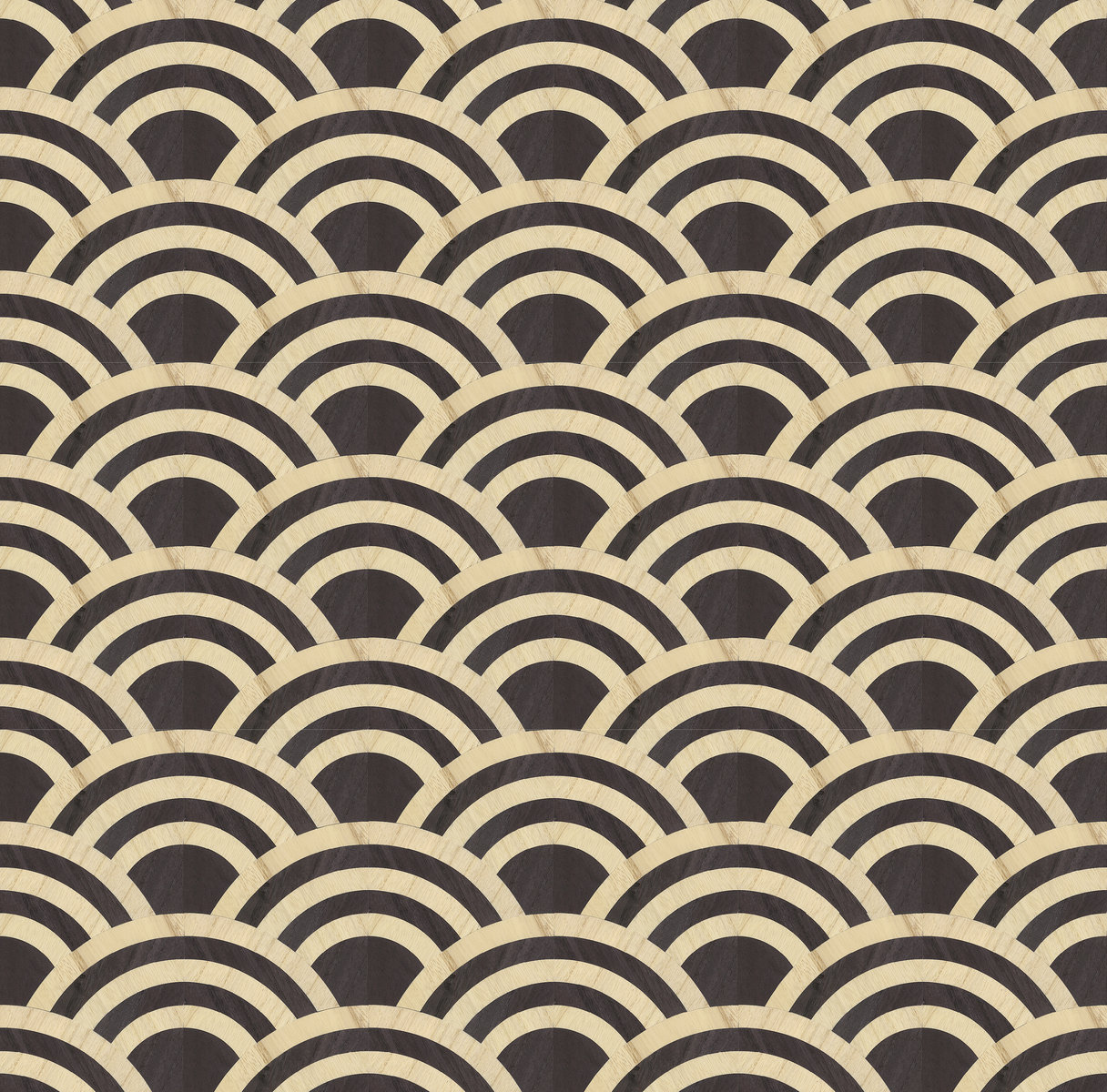 重叠的 O, 由木贴面镶嵌物创建, 类似于海洋的滚动波。独特的壁墙覆盖的古代西盖哈图案象征着水波,代表着好运、力量和韧性。