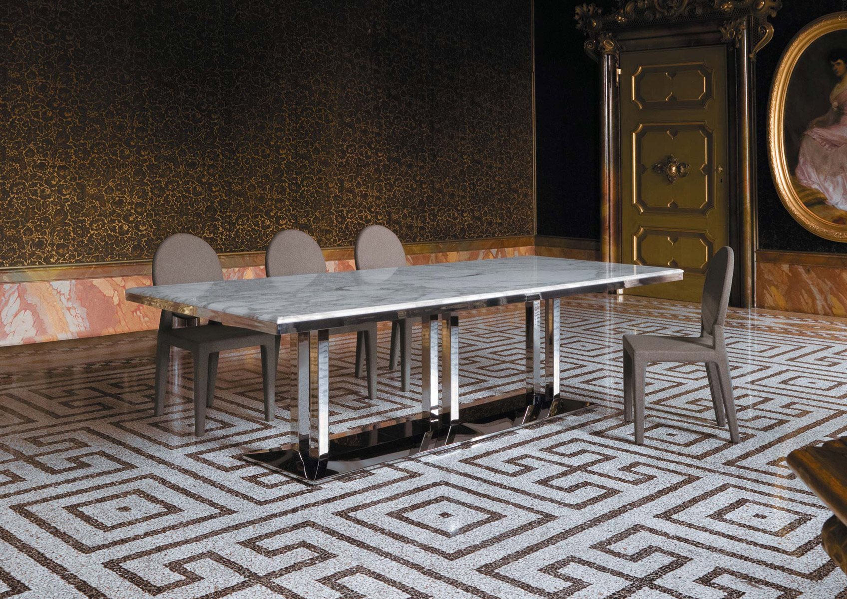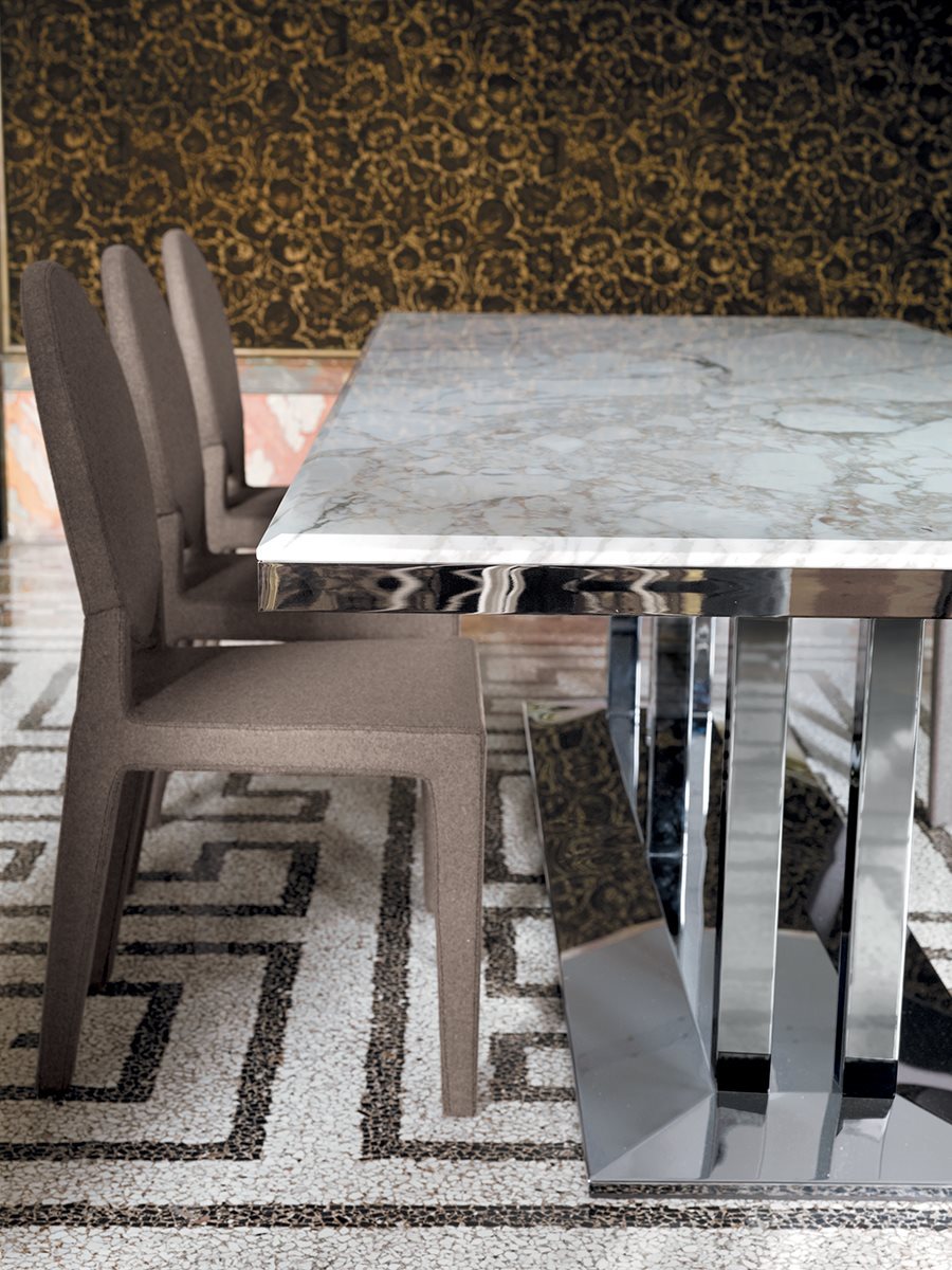 钢质餐桌,采用磨削工艺搭配激光切割制成。结构饰面:亮光浅金、亮光渐变棕、哑光香槟金、亮光镀铬、亮光镀黑铬、哑光缎面青铜、黑玫瑰金。台面可选:厚度20mm磨斜边20mm大理石:Fusion Light大理石、Patagonia大理石、Explosion Blu大理石、Fusion Multicolor大理石、Quarzo Juliet大理石、Sahara Noir大理石(聚酯面漆)、Dover White大理石、Panda White大理石、Verde Guatemala大理石、Corteccia大理石、Port Saint Laurent大理石、Rosso Levanto大理石、Bardiglio Nuvolato大理石、Elegant Brown大理石、Palissandro Oniciato大理石、Emperador Dark大理石、Silver Wave大理石、Agatha Black大理石、Frappuccino大理石、Calacatta Gold大理石。磨斜边20mm钢化水晶,颜色可选:黑色涂漆10mm水晶、青铜色或烟熏色6mm镜面。