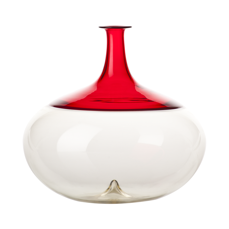 一个花瓶,一个瓶子。红色和纯粹的稻草黄色。塔皮奥·维尔卡拉创造的两种截然不同的色彩空间,由于"Incalmo"技术而融合在一起,这个过程将两块吹制的玻璃熔化在一起。