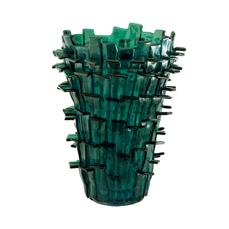 富尔维奥·比安科尼的这一作品源于 20 世纪最具创新性的玻璃制造技术:薄薄的矩形玻璃条放在另一块玻璃上,然后手工涂在由吹制玻璃制成的圆锥形底座上。彩虹绿色和海蓝宝石的阴影满足彩虹沙和红色色调在一块如此永恒,但日期为1989年。