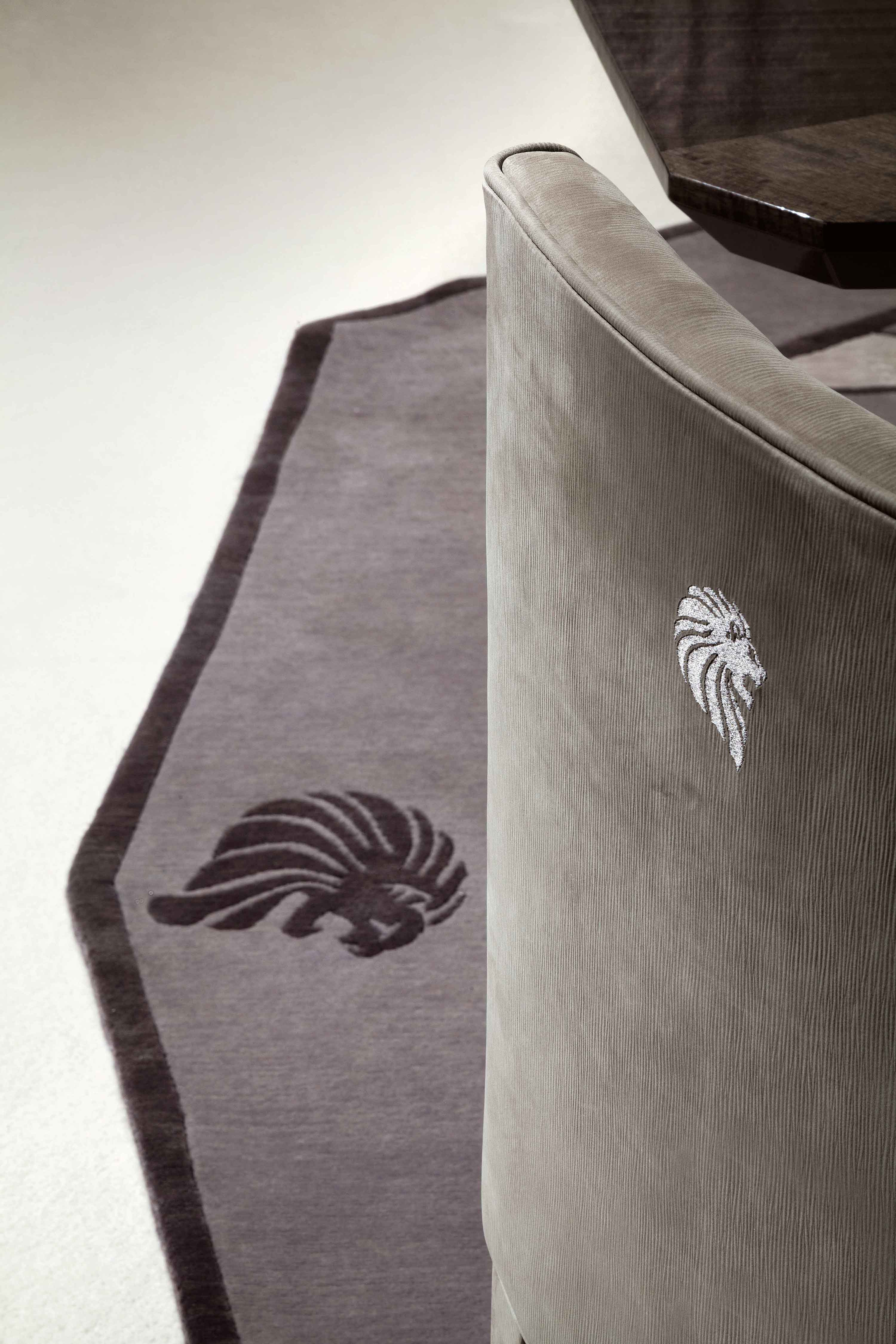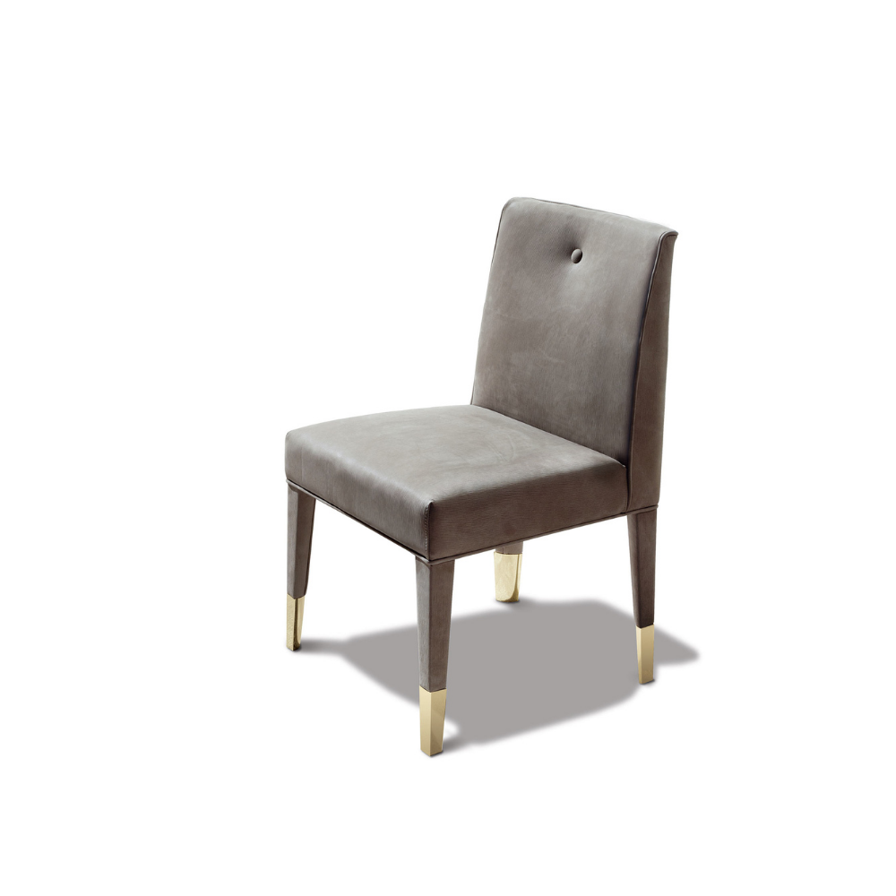 完全上装的侧椅。回到乔治收藏标志。4条腿在浅金色铬不锈钢。