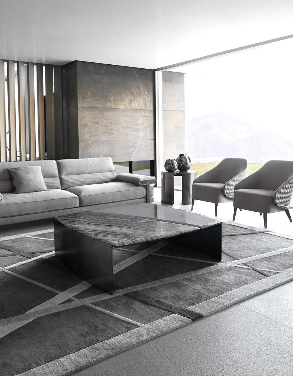 鸡尾酒桌与顶部结合黑色肯尼亚大理石和马达加斯加 fügured 莫温吉贴面在高光泽聚酯完成。缎黑色镍不锈钢的弯曲腿与激光乔治收藏标志。