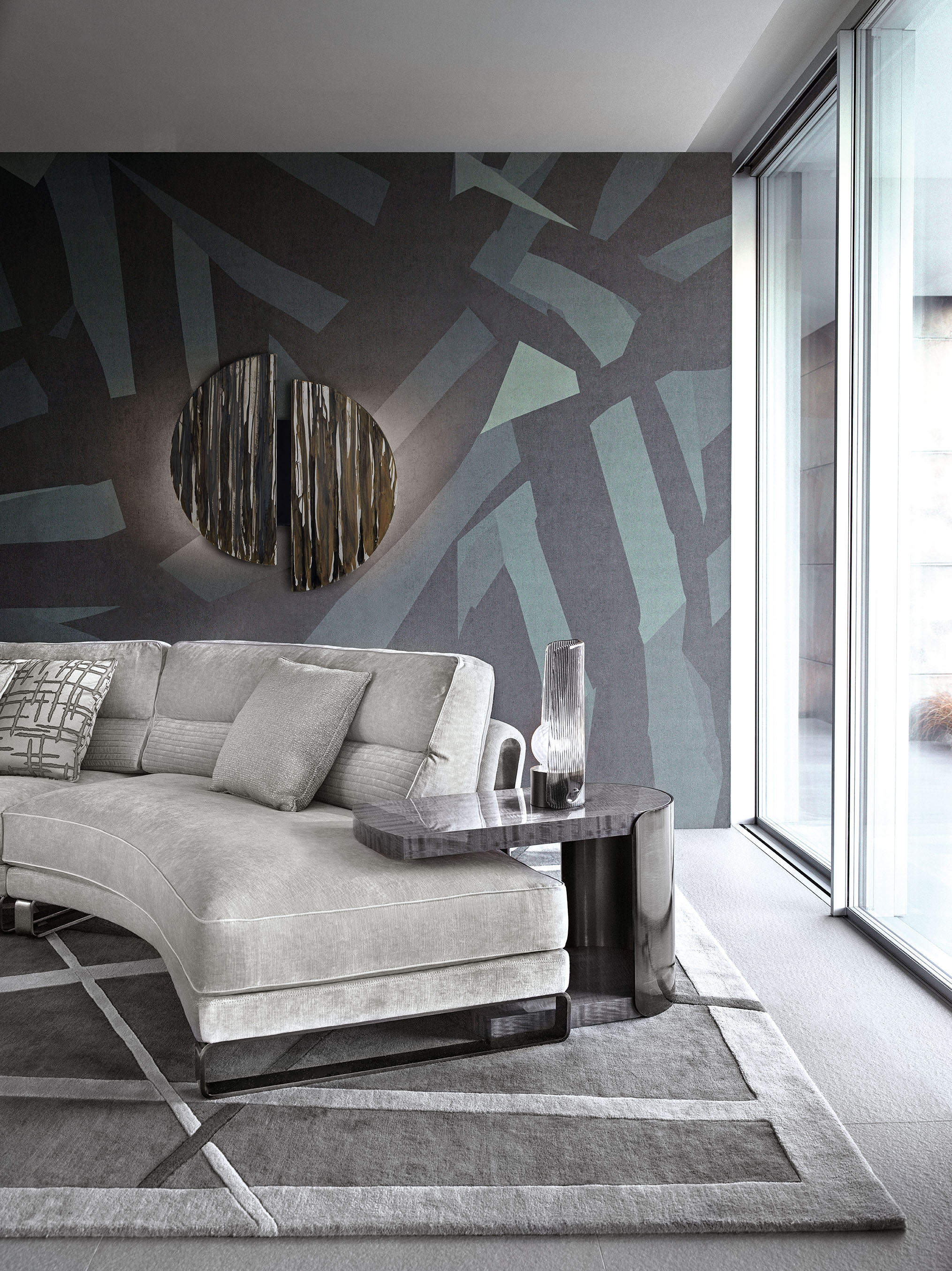 高光泽聚酯面的鸡尾酒沙发桌。弯曲的腿在缎黑色镍不锈钢与激光乔治收藏标志。
