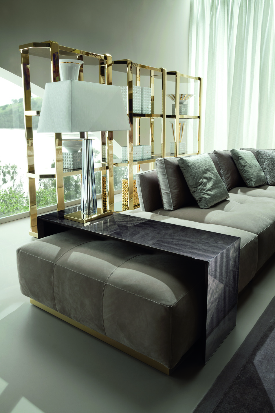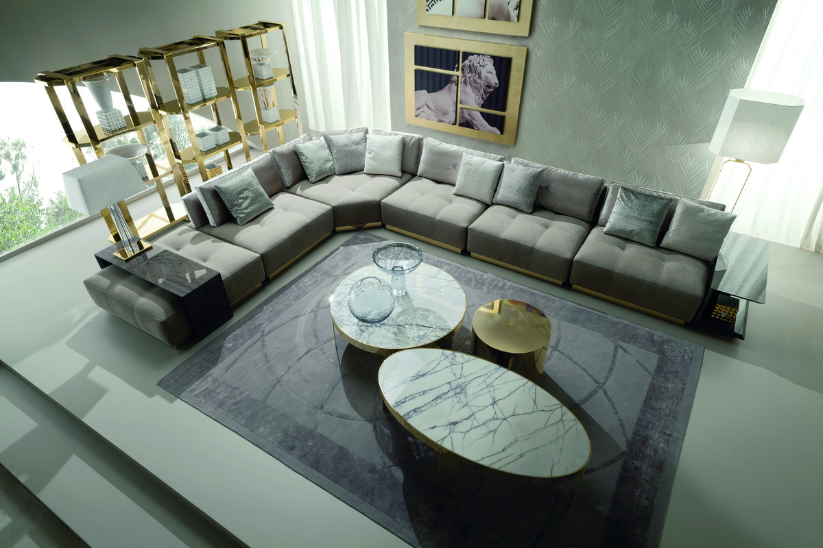 沙发鸡尾酒桌在马科雷红木贴面与高光泽聚酯完成。