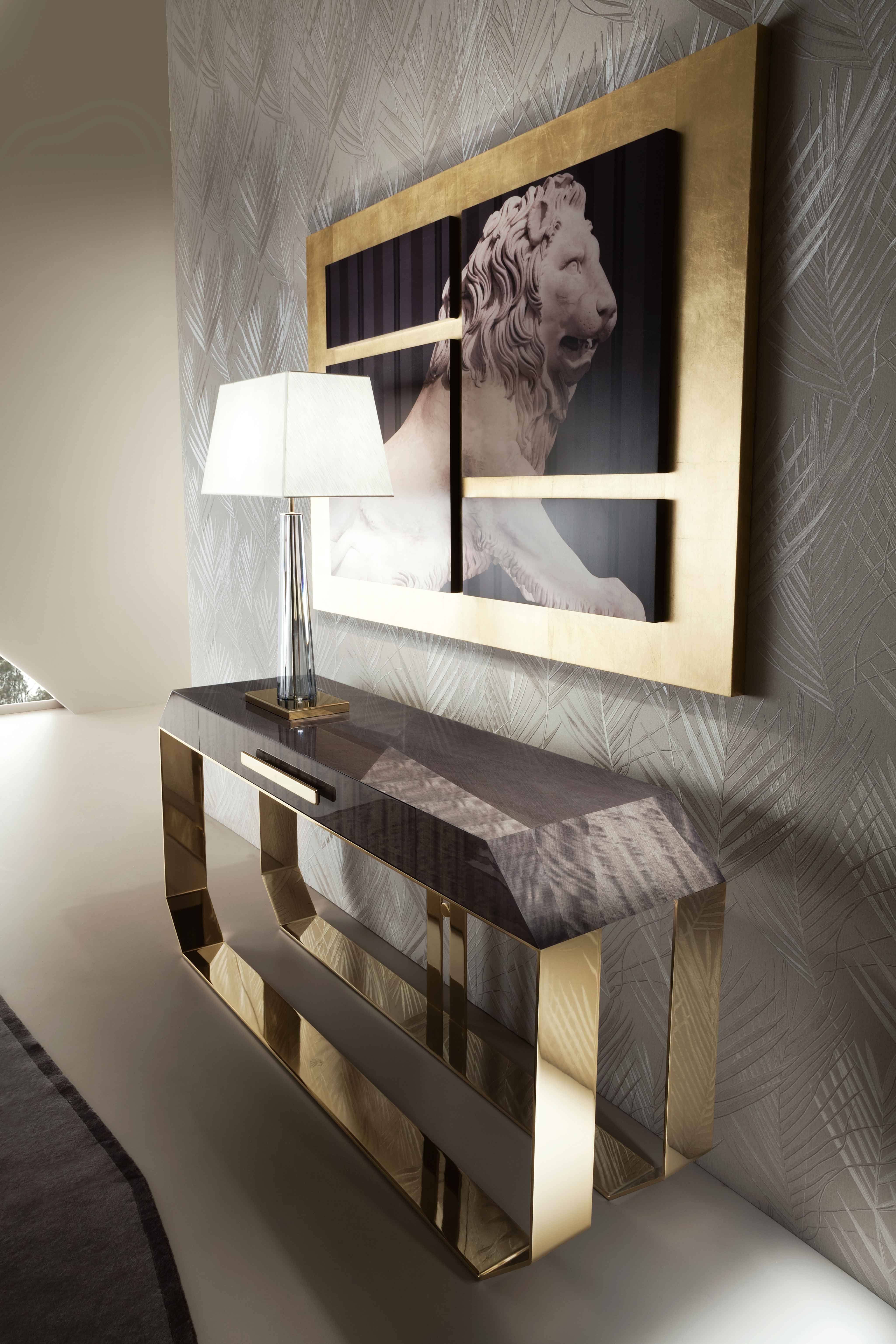 控制台在马科雷红木贴面与高光泽聚酯完成。镶嵌贴面顶部。基地和手柄在浅金色铬不锈钢与乔治收藏标志。天鹅绒织物的 1 个全扩展抽屉 w/ 底部。