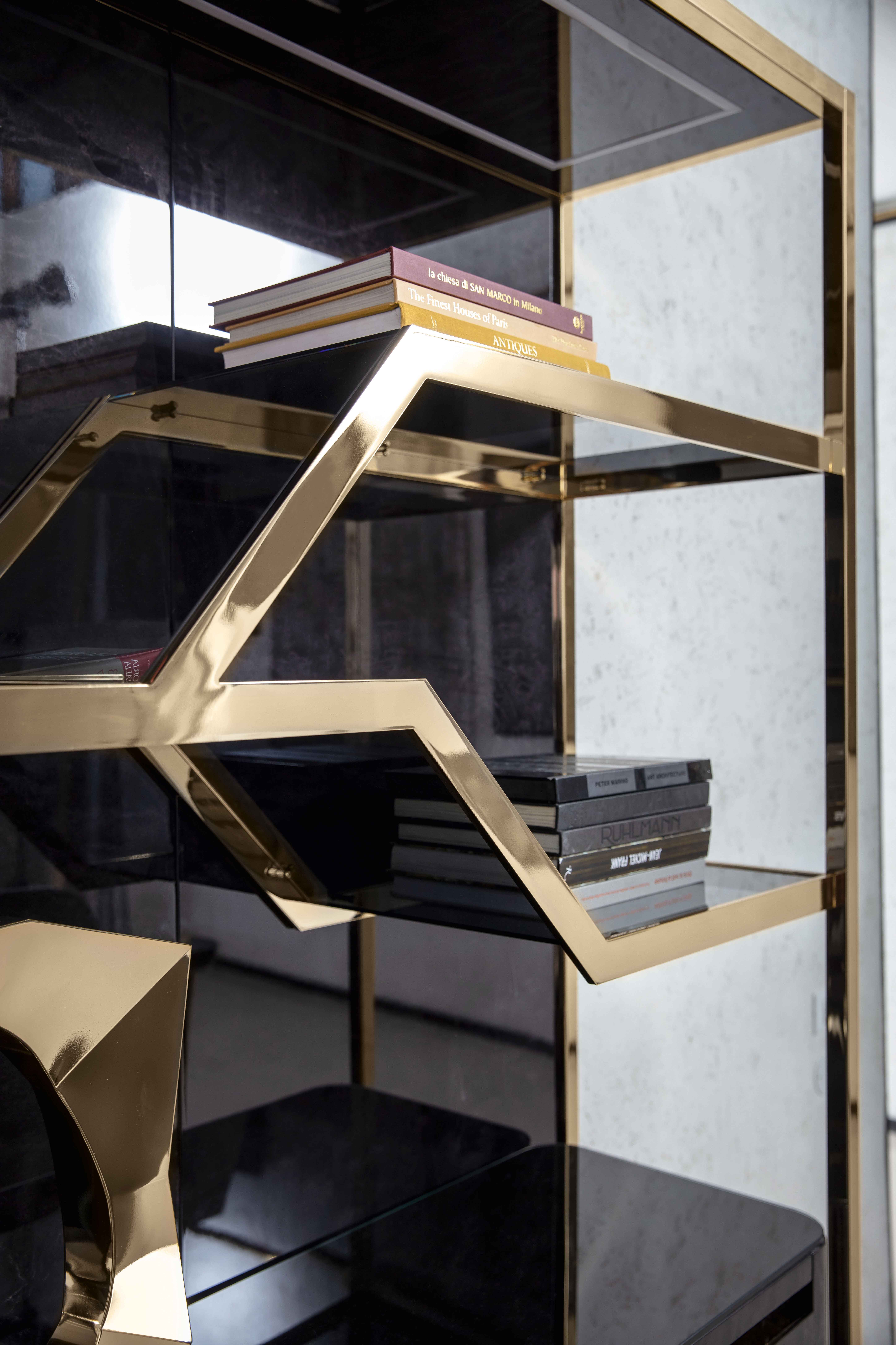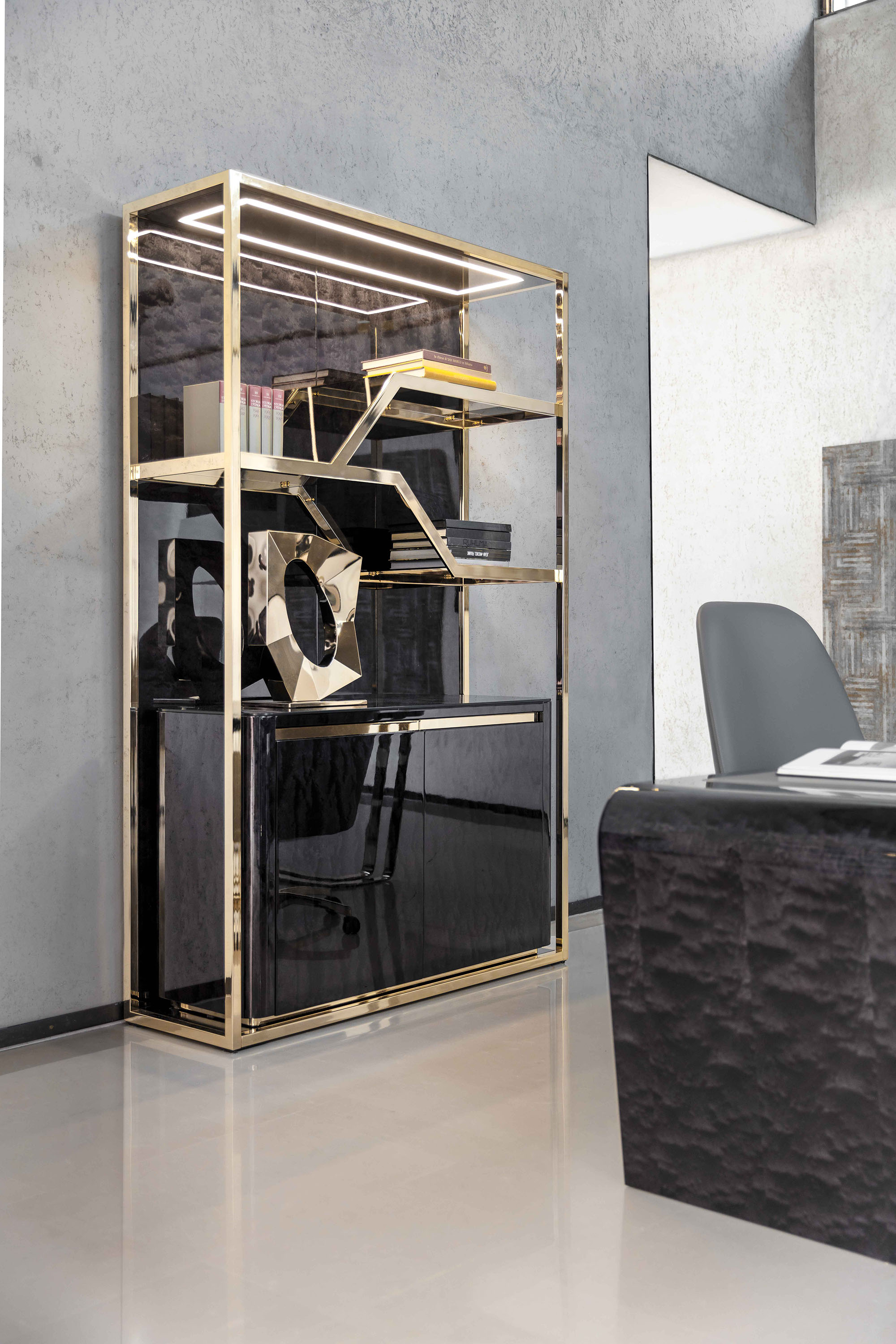 书柜在黑色布宾加毛刺贴面与高光泽聚酯完成。木背,2门,2个玻璃可调搁板。顶部带有引导光。轻金铬不锈钢的结构、底座和手柄。5个烟熏钢化玻璃架子。