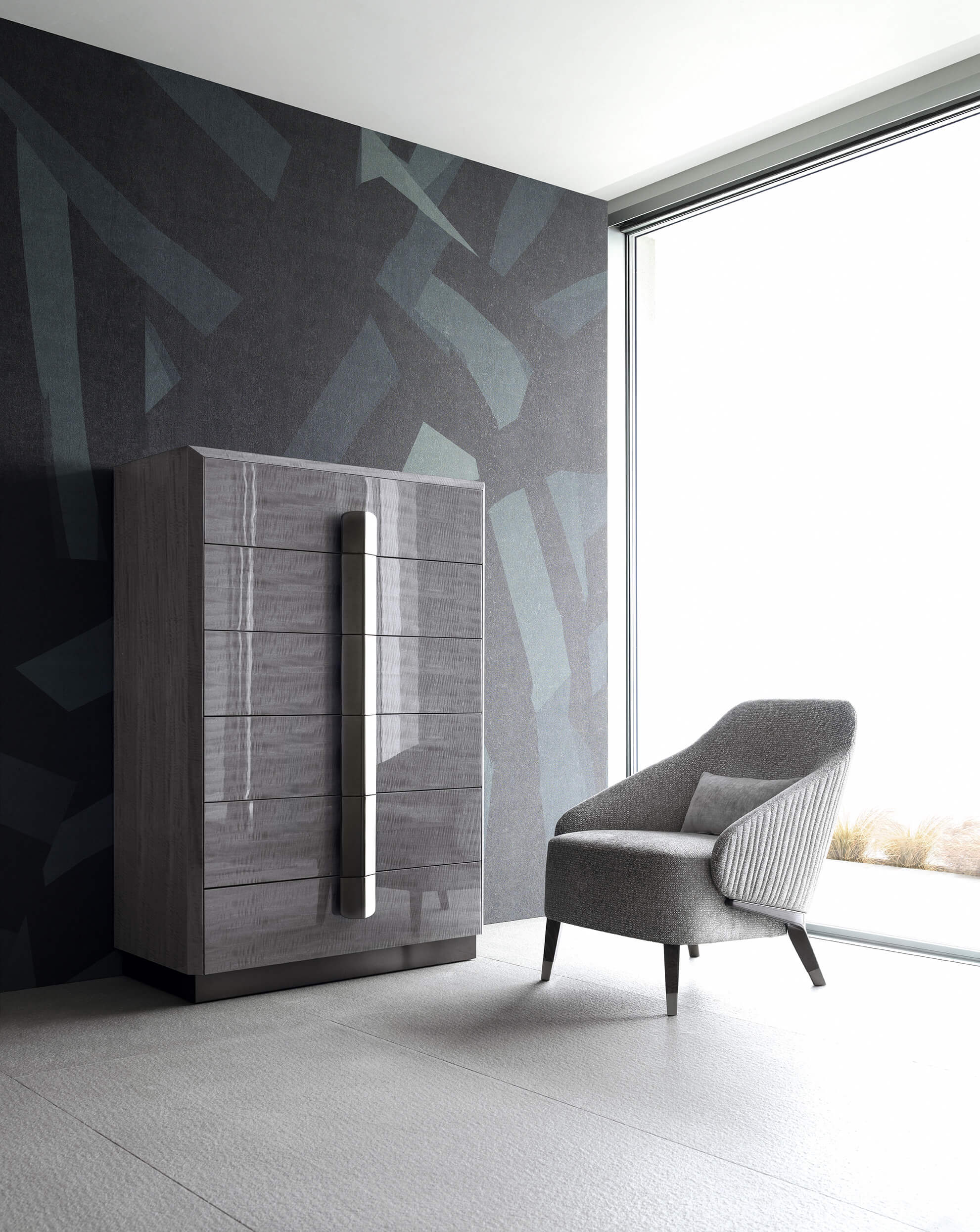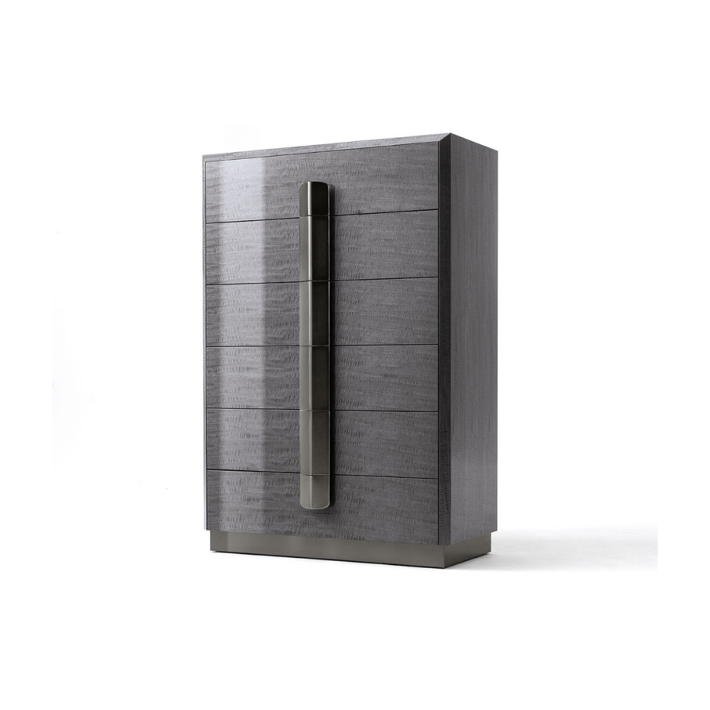 马达加斯加的胸部认为莫温吉贴面在高光泽聚酯完成。缎黑色镍不锈钢底座和手柄。6 个全扩展抽屉,底部部分为天鹅绒织物。