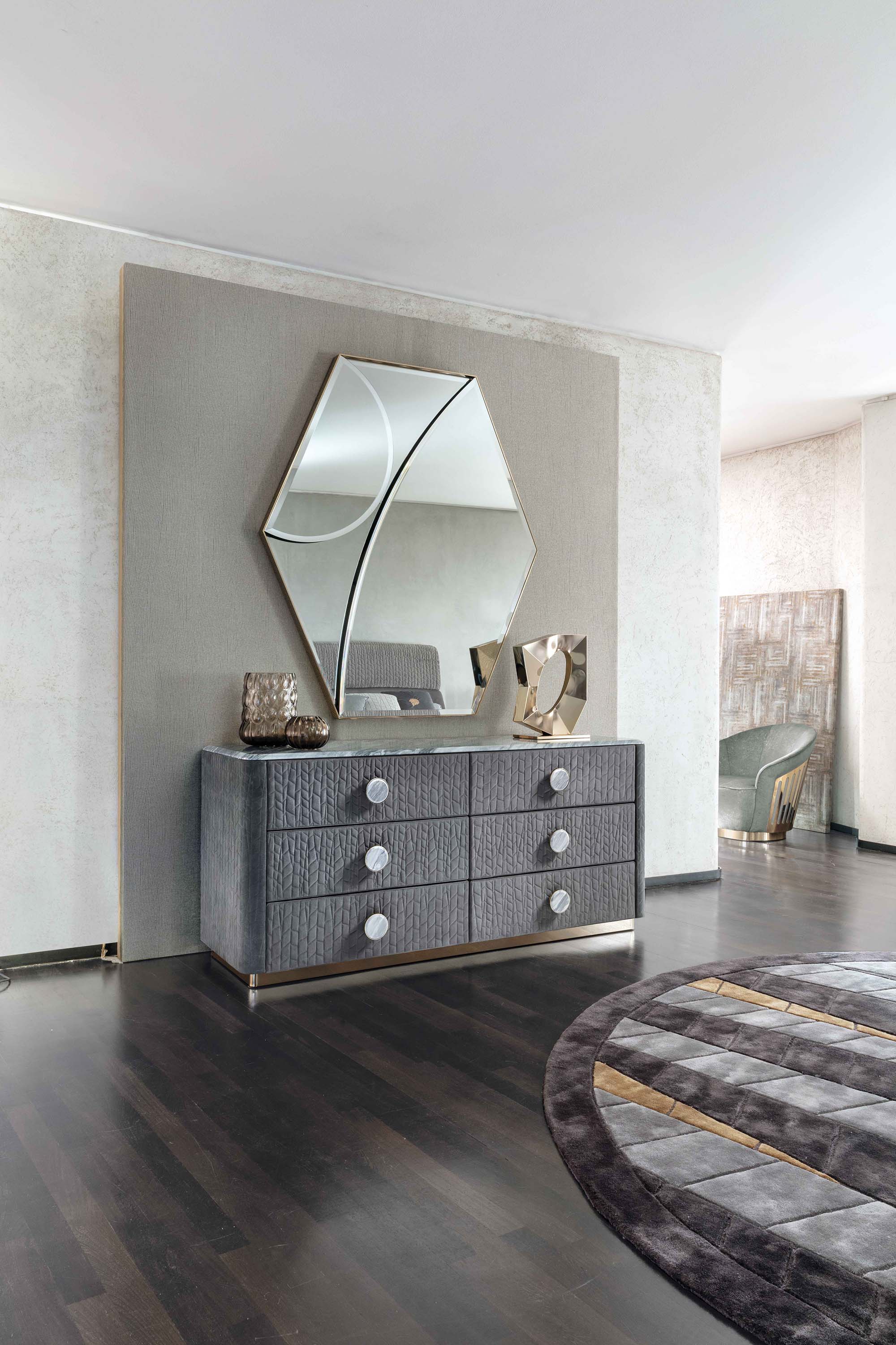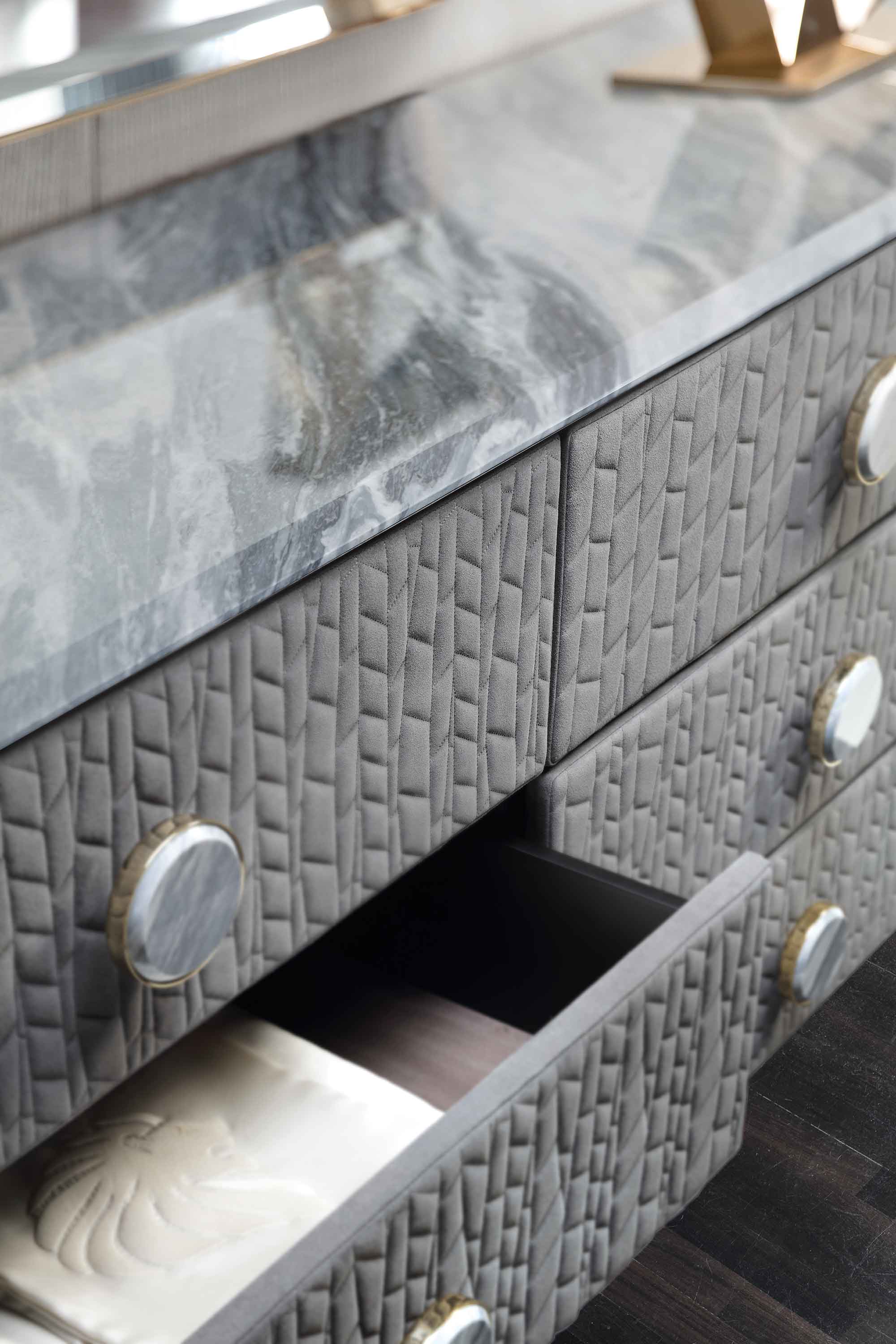 梳妆台在被缝制的灰色核素颜色 nr 6 与顶部在斜面大理石。以浅金色铬不锈钢为基础。6 个大中心手柄与金铬不锈钢和斜面大理石相结合。6 个全扩展抽屉,底部部分为天鹅绒织物。
