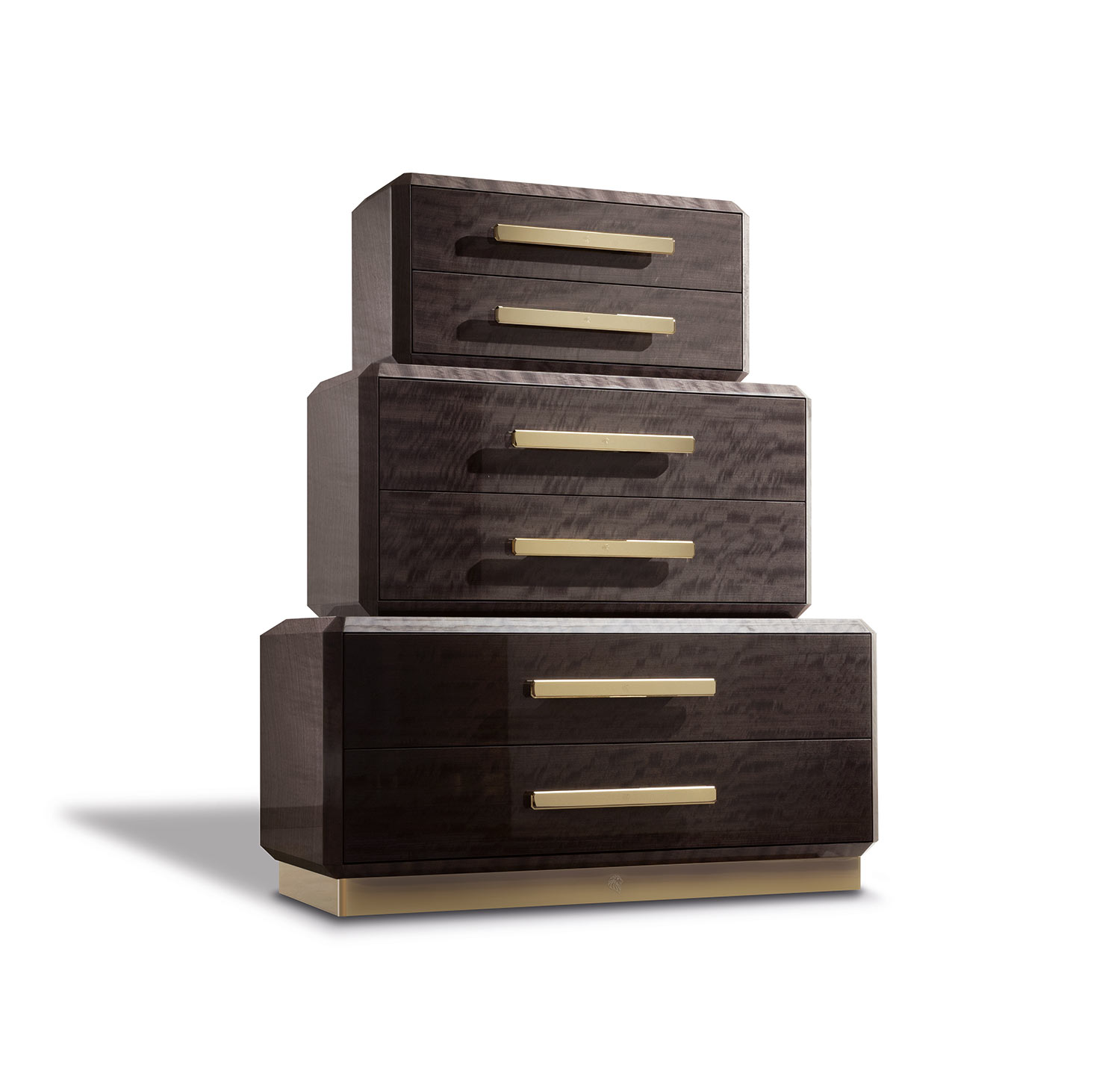 3 步胸部在 makoré 红木贴面与高光泽聚酯完成。6 个全扩展抽屉,底部部分为天鹅绒织物。底座和手柄在浅金色铬不锈钢与乔治收藏标志。