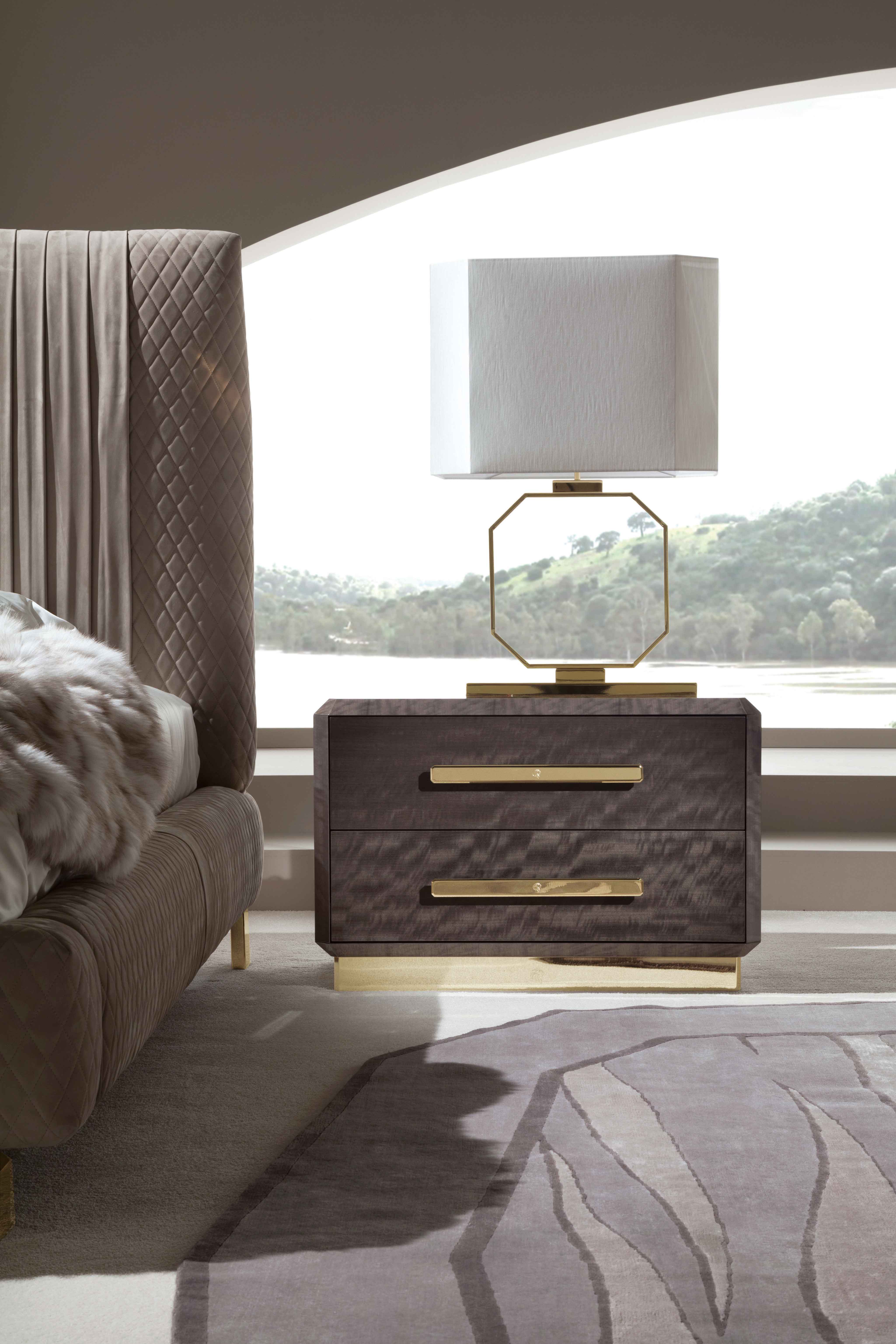 马科雷红木贴面的夜桌与高球聚酯完成。镶嵌贴面顶部,2个全扩展抽屉,底部部分在天鹅绒织物。底座和手柄在浅金色铬不锈钢与乔治收藏标志。