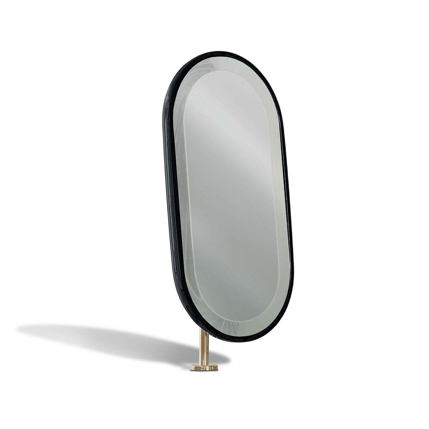 镜面顶部的虚荣心办公桌在黑色布宾加毛刺贴面与高光泽聚酯完成。浅金色铬不锈钢细节。