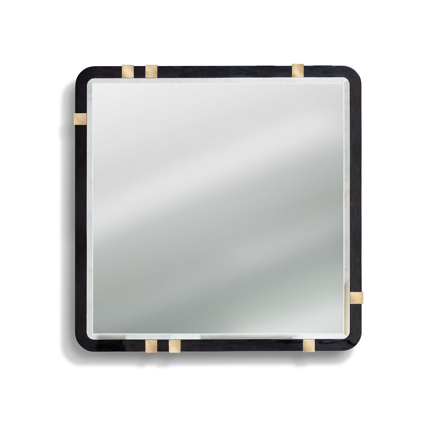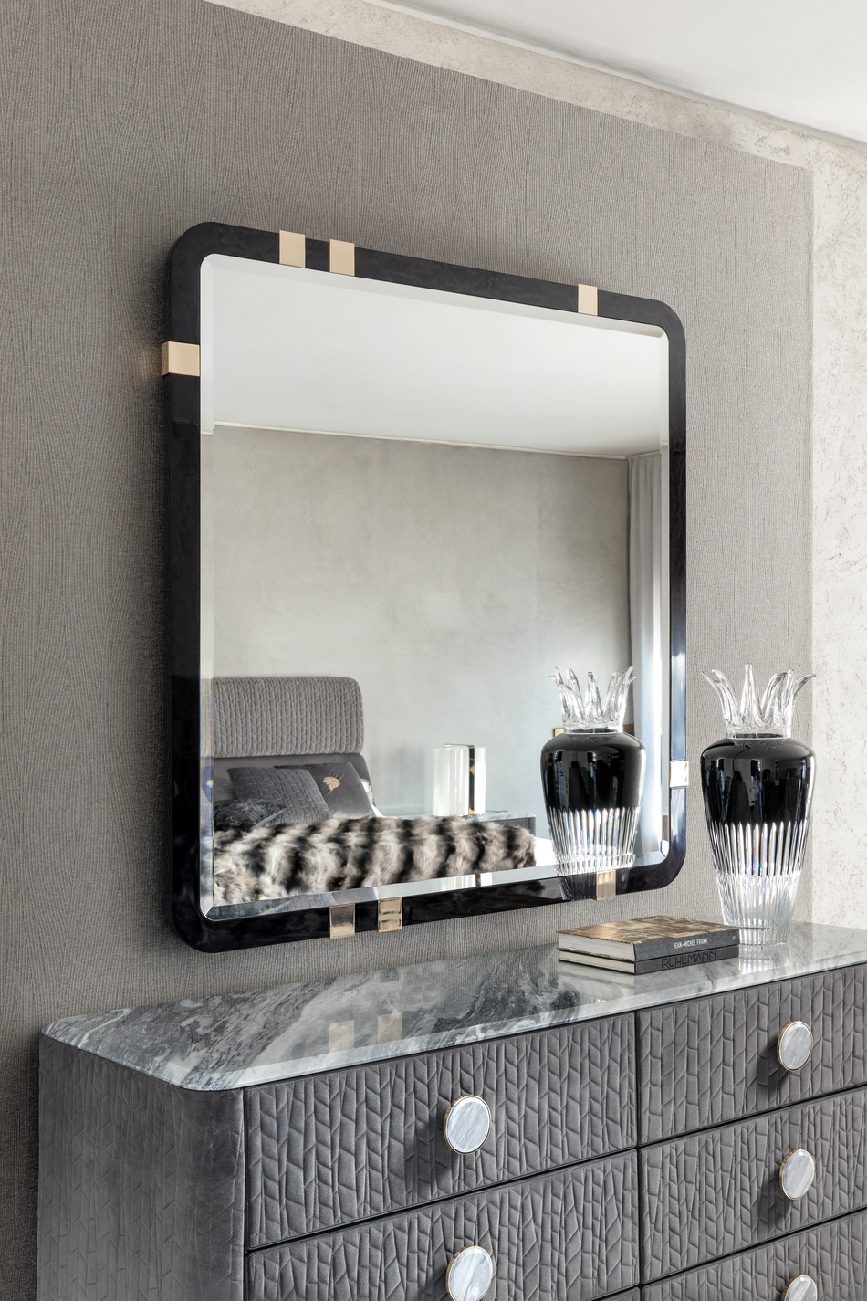 带斜玻璃的方形镜子。框架结合黑色布宾加毛刺贴面与高光泽聚酯表面和浅金色铬不锈钢。