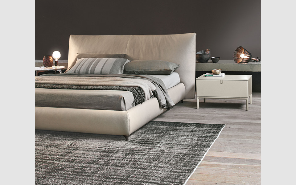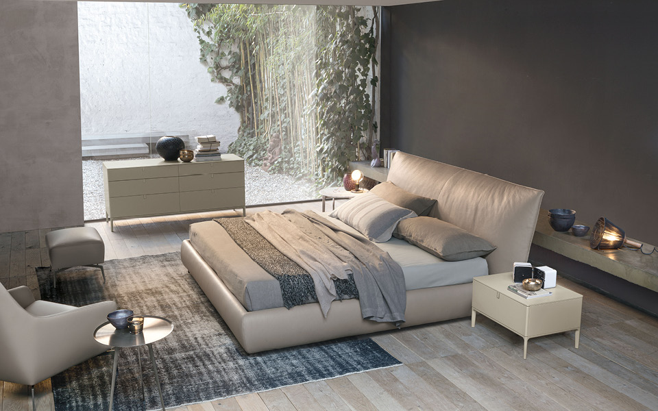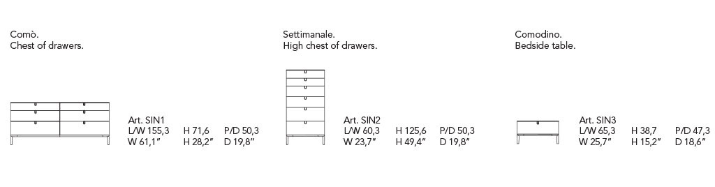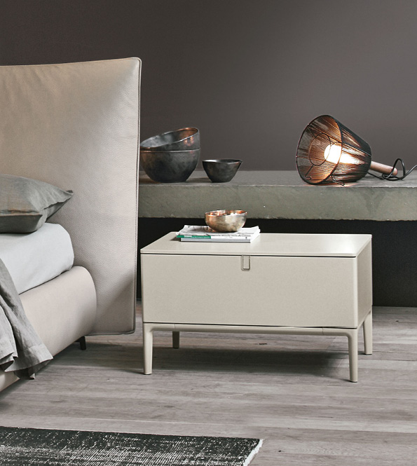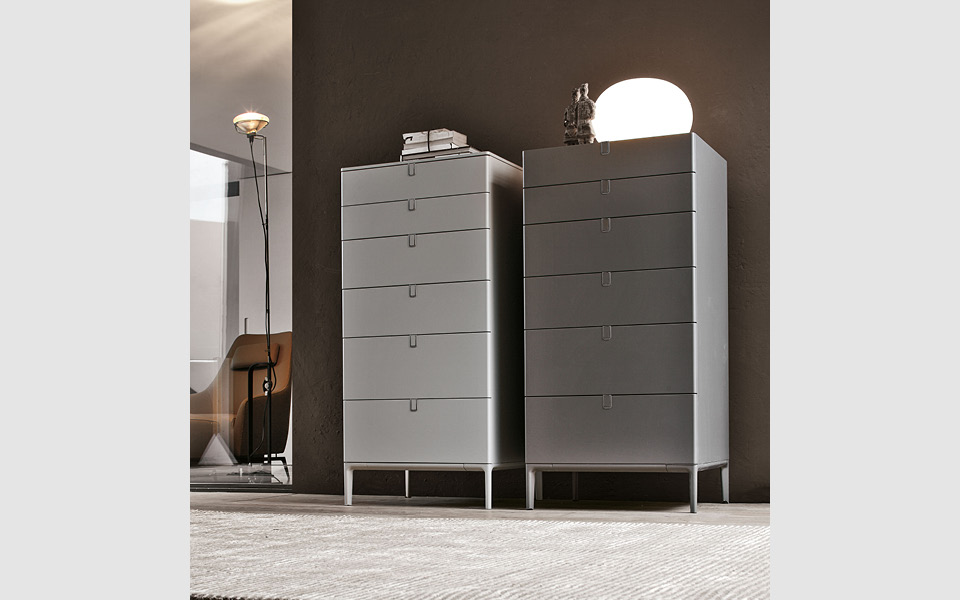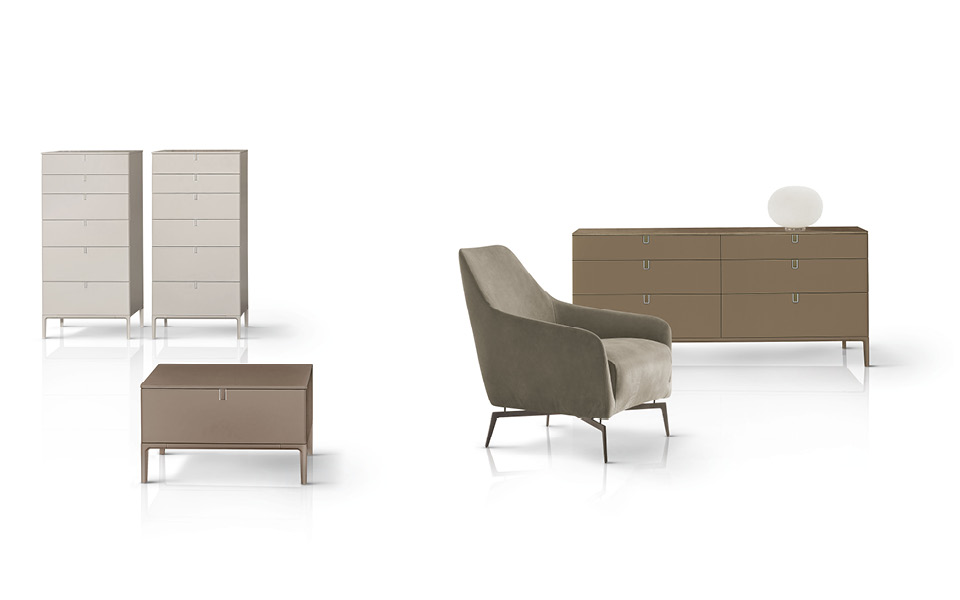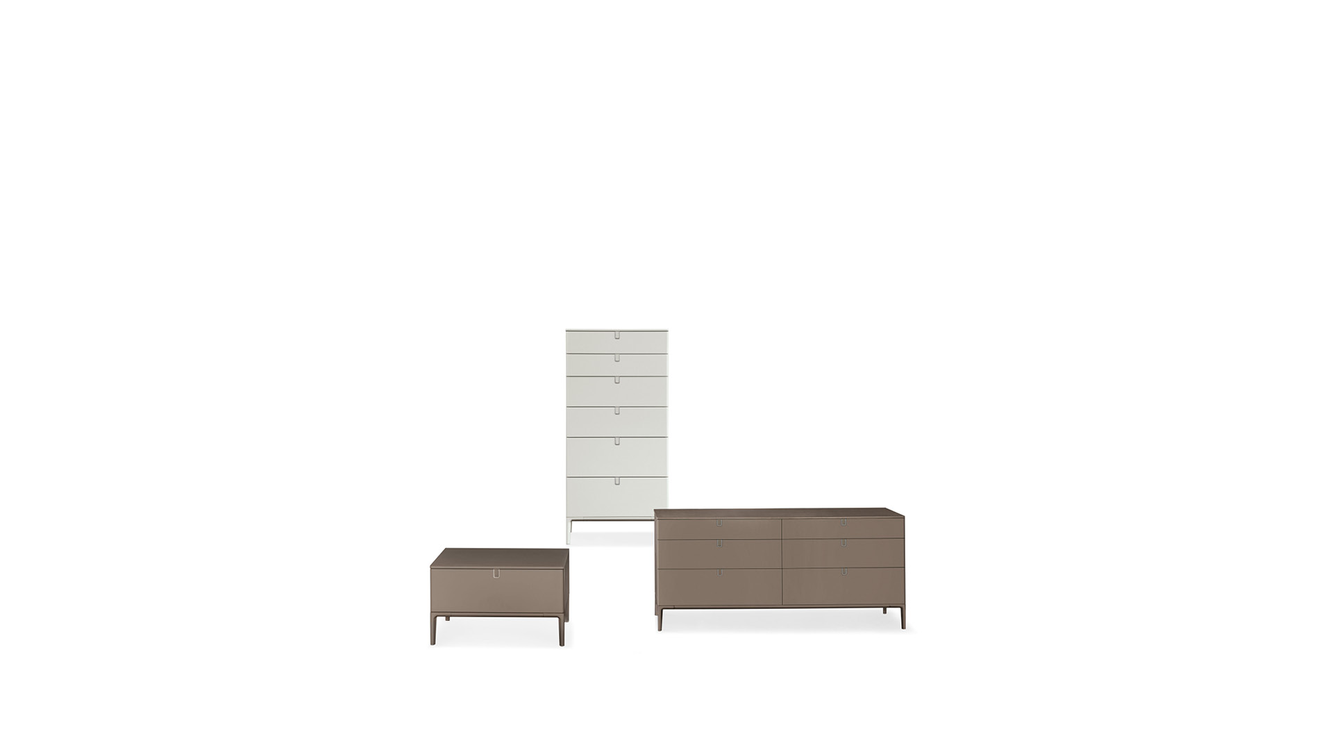 一系列带抽屉柜、床头柜和高高的漆面补品抽屉的箱子。其优雅性由保证手柄的形状突出审美的连续性,并通过纤细的油漆或抛光铸造铝腿。