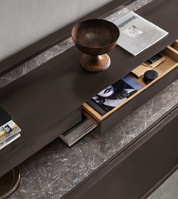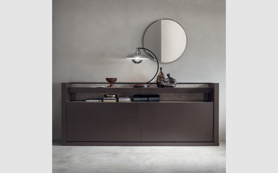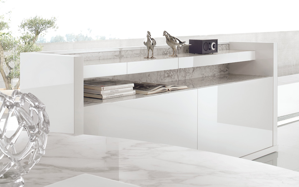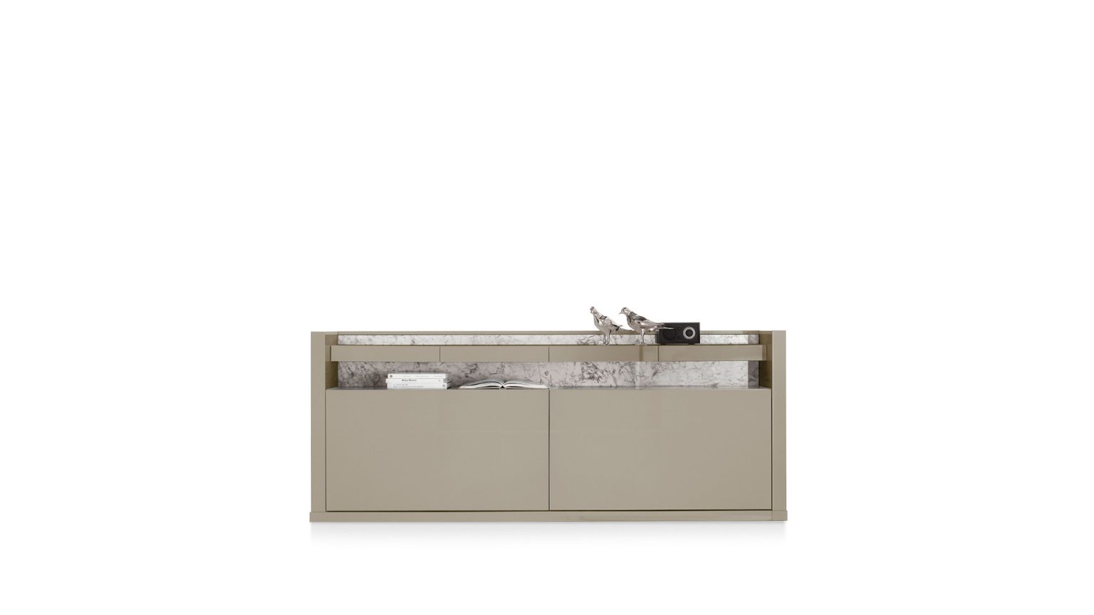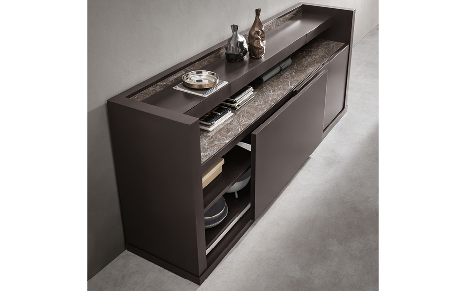 神话般的光泽波特兰与推拉门和上架与四个抽屉。宽敞多功能的解决方案,由搁板和隔间制成被推拉门关闭。大理石或"皮埃特拉塞雷纳"石头的顶部。