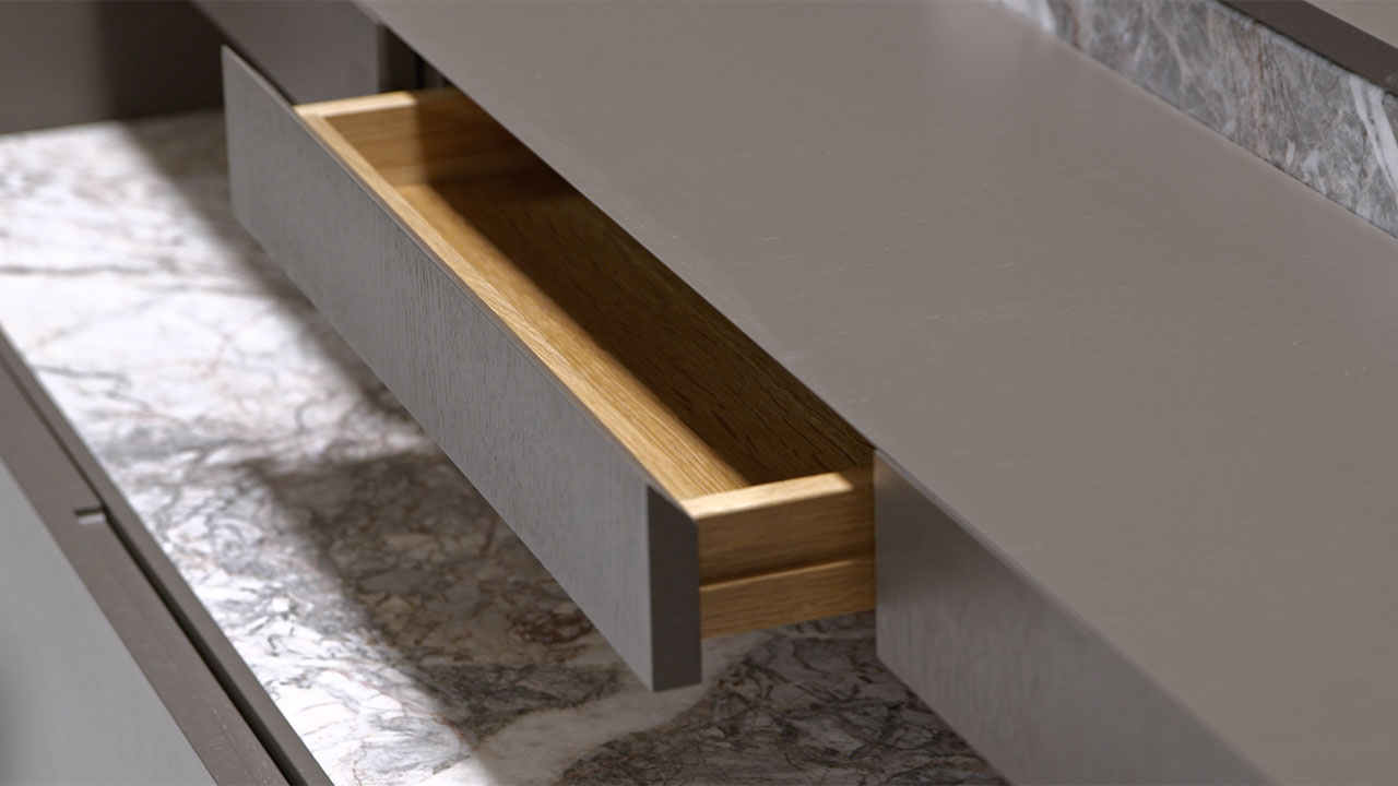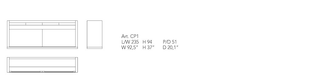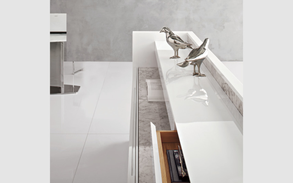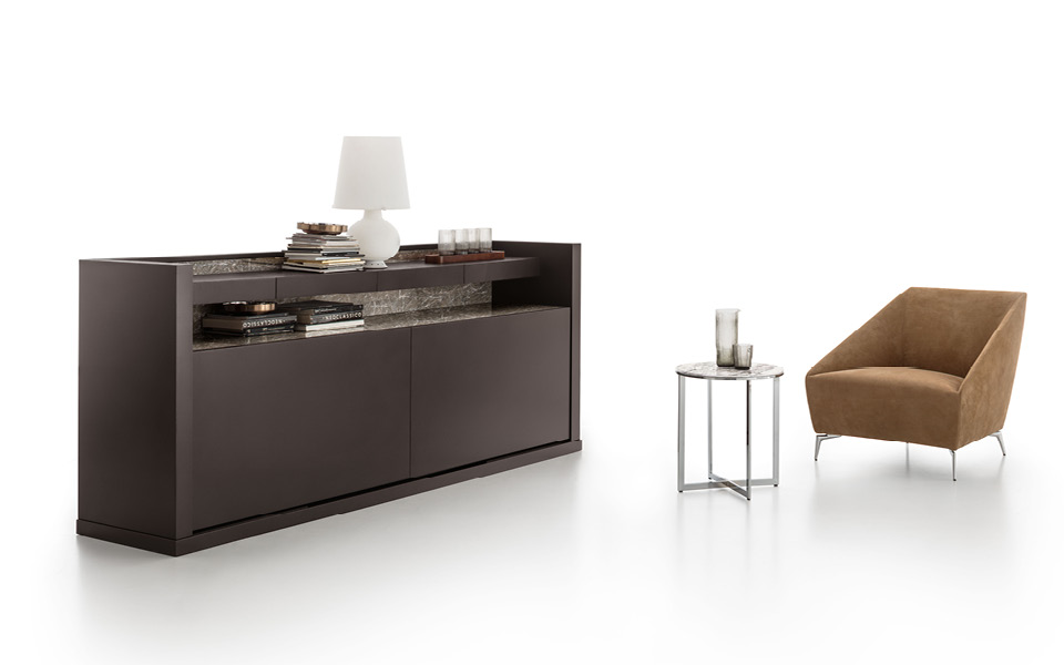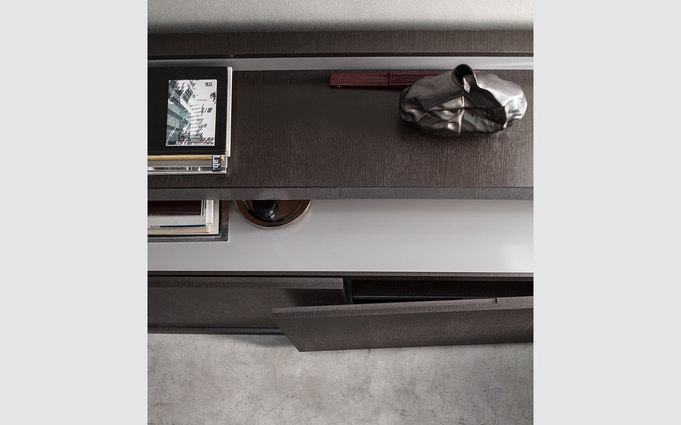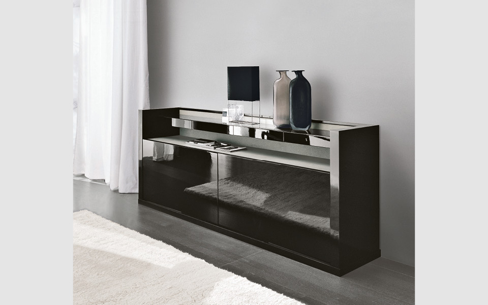 神话般的光泽波特兰与推拉门和上架与四个抽屉。宽敞多功能的解决方案,由搁板和隔间制成被推拉门关闭。大理石或"皮埃特拉塞雷纳"石头的顶部。