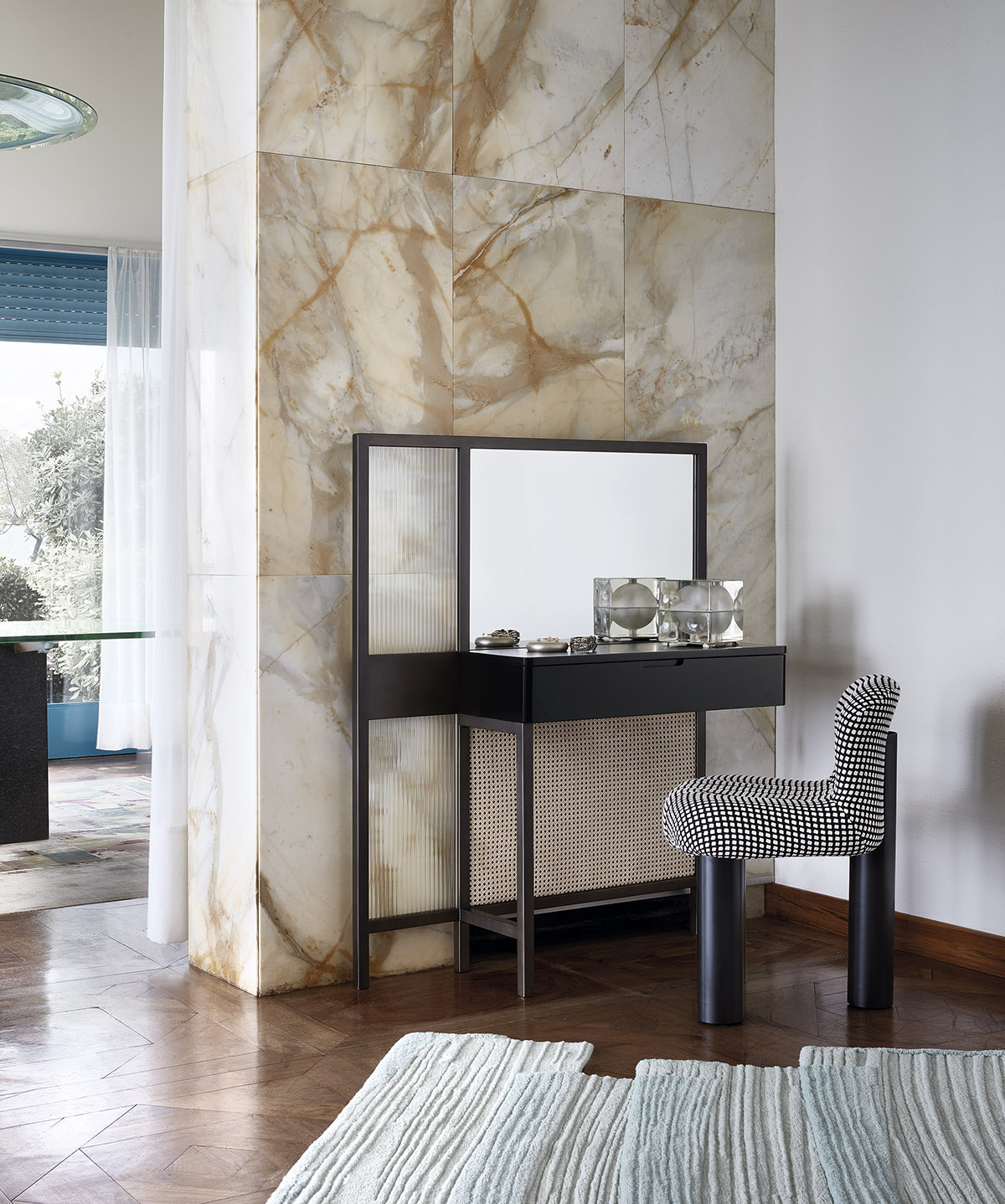 对于"阈值"屏幕系列的设计,Neri&Hu 提出了一个独立分区,该分区具有结构、重要性和维度。屏幕填充了各种材料,如镜子、藤条和波纹玻璃,性能非常好,而且是隐私层,但其功能远不止于此。