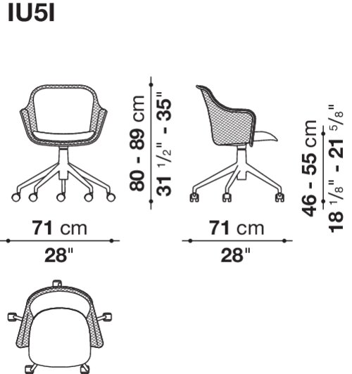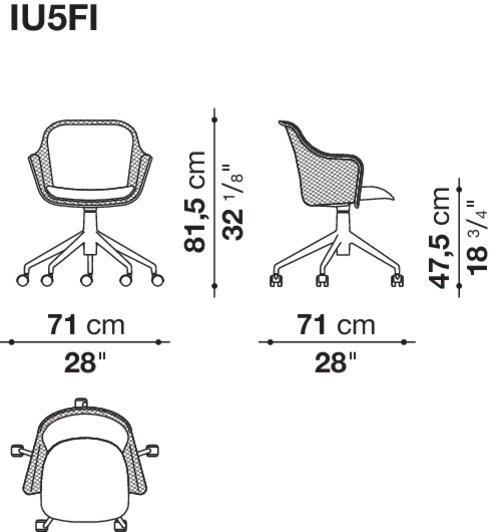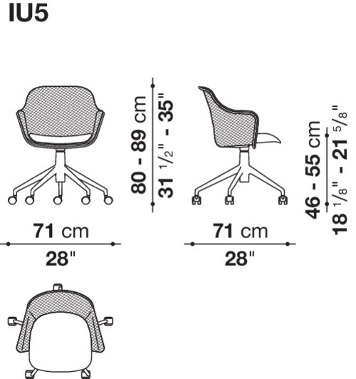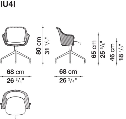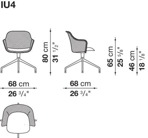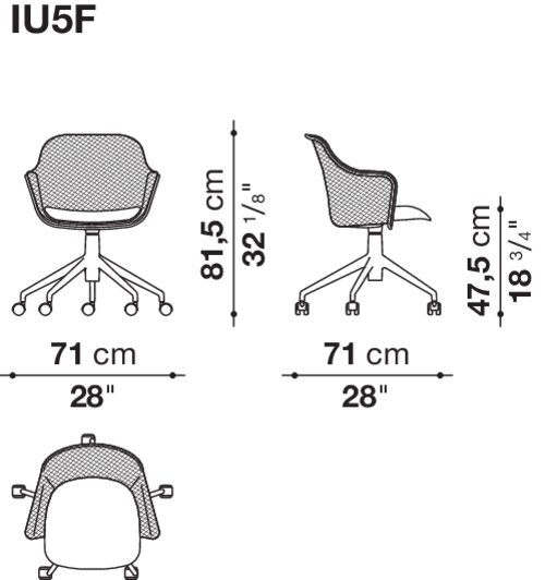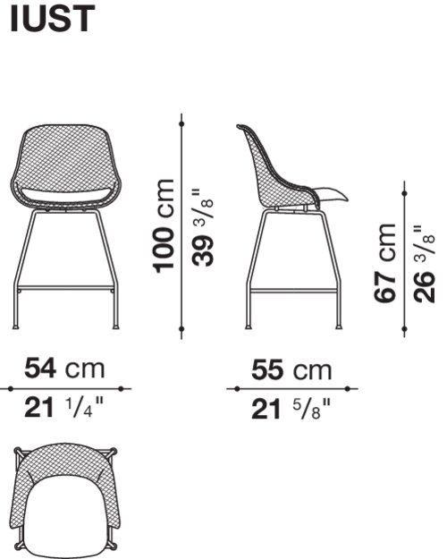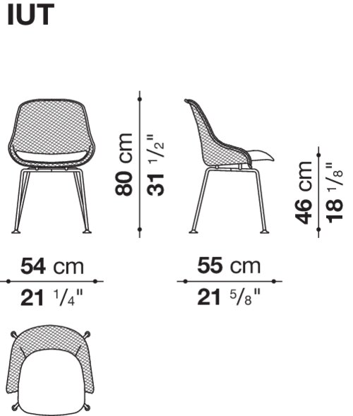 扶手椅、椅子和凳子版本的 Iuta 由边缘的金属网状技术外壳组成,无论有无扶手。转椅的结构为铝制,有四、五个辐条,车轮和高度调整:椅子和凳子的结构在钢棒里。
