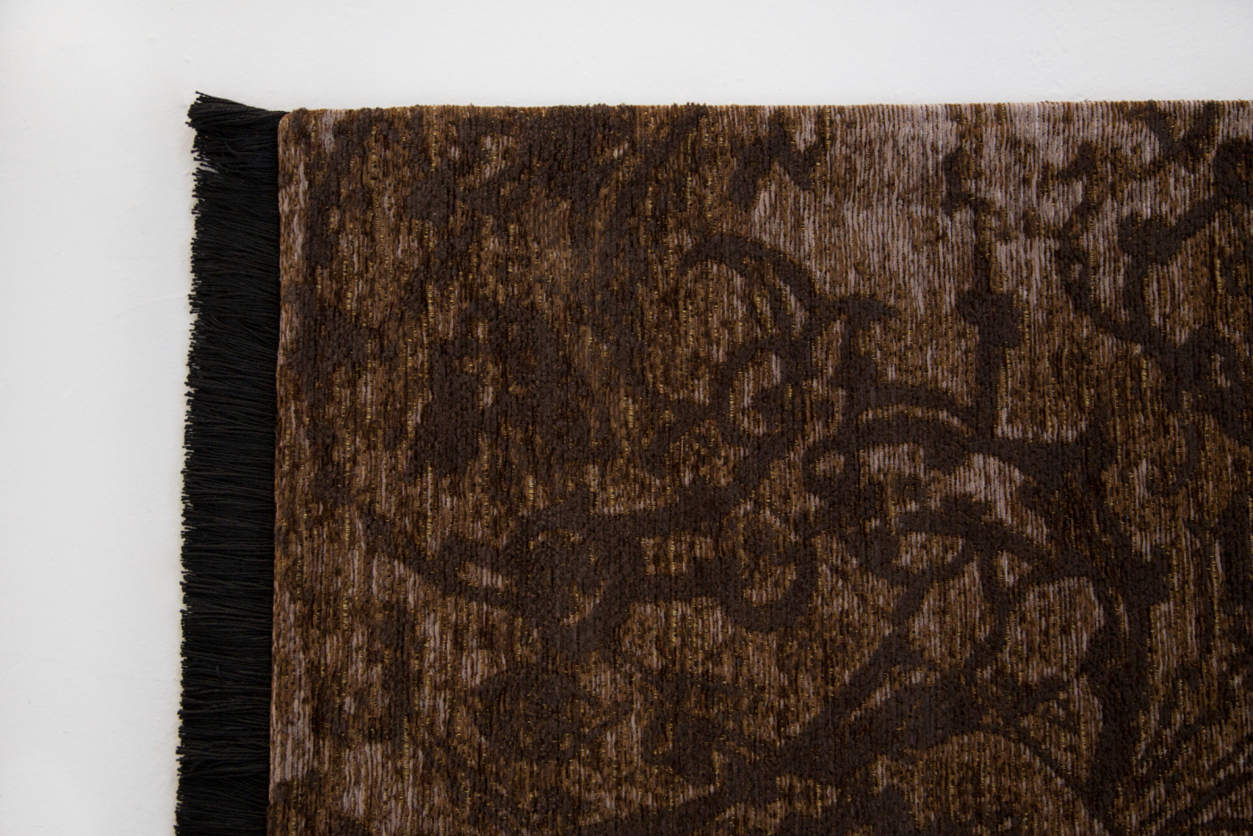 Boccioni 是一种工业纱线地毯,带有淡褐色和黑色或马沙拉色和深棕色饰面的复古镶嵌物。