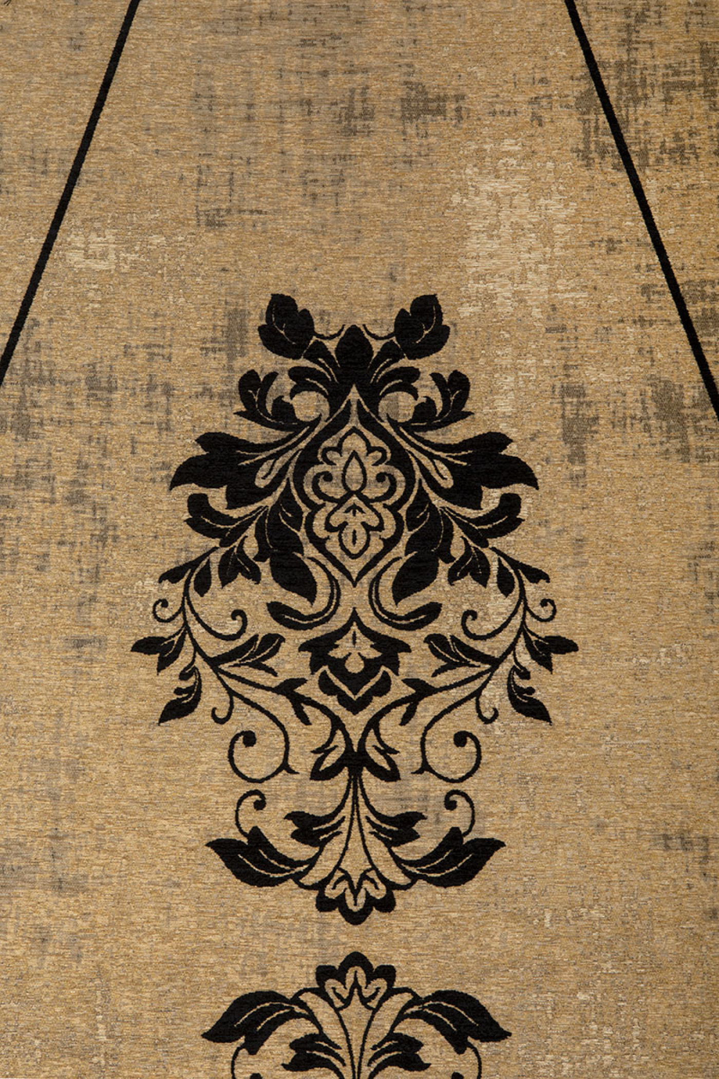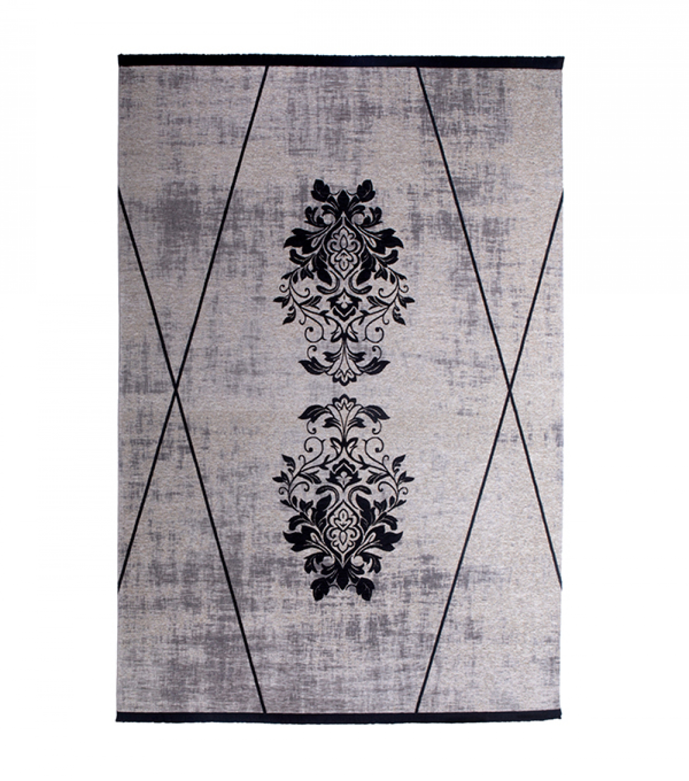 Palmanova 是一种工业纱线地毯,饰有中央锦缎和流苏。提供黑色和金色混色,或黑色和银色。
