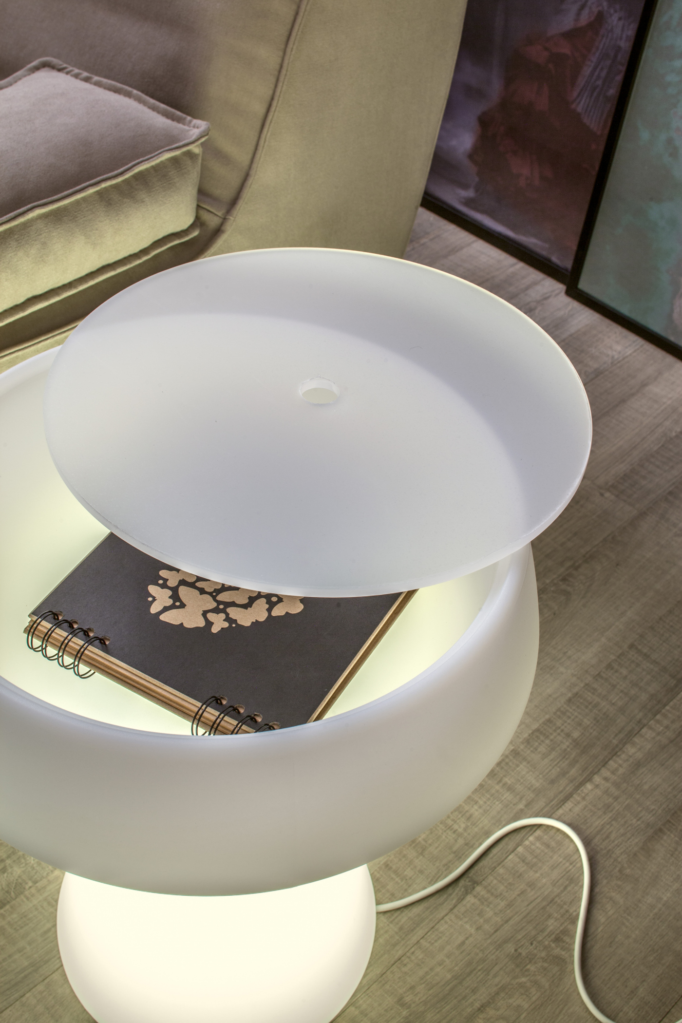 一种特殊形状的小边桌,在结构的聚乙烯与顶部的木材连接处紧密向上打开。 在有光的版本中,Maki 也是一个容器,一个照亮你房间的物体。