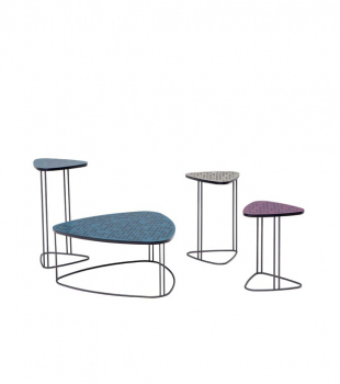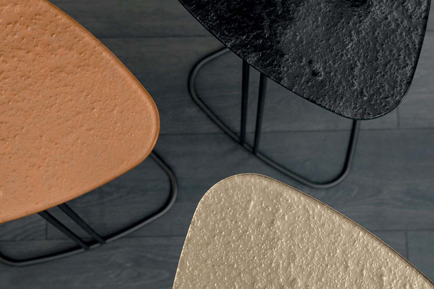 咖啡桌的组成,底座为漆面金属,桌面为漆面中密度纤维板和数字印刷或锤击玻璃。各种高度和尺寸以满足各种需求。