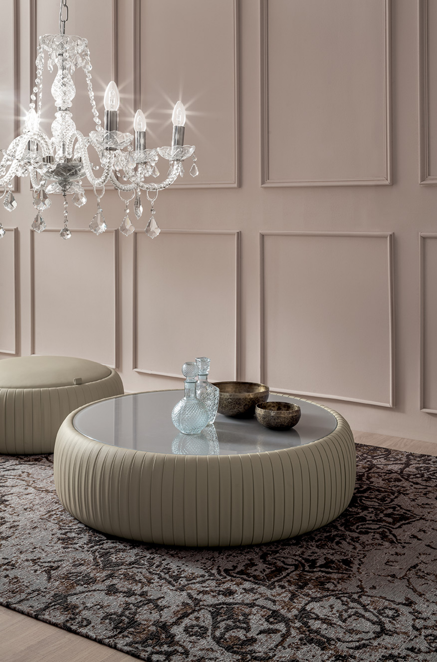 Plissé 既可以提供带钢化玻璃桌面的咖啡桌的功能,也可以提供舒适的容器坐垫凳的功能。它有两个版本,特点是在生态皮革上手工制作褶皱。由于有大量的颜色可供选择,生态面料的选择变得更加有趣。