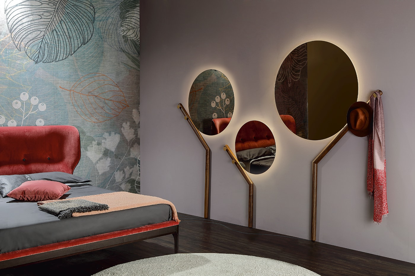 多功能和极简主义是Family mirrors表达的概念。镜子结合了实心胡桃木的灵活结构、北欧优雅的衣帽架以及银色或青铜饰面的简单圆形镜子。由于采用了 LED 背光系统,完成了这个具有独特几何形状的人物,其在墙壁上的效果独特、优雅和珍贵。