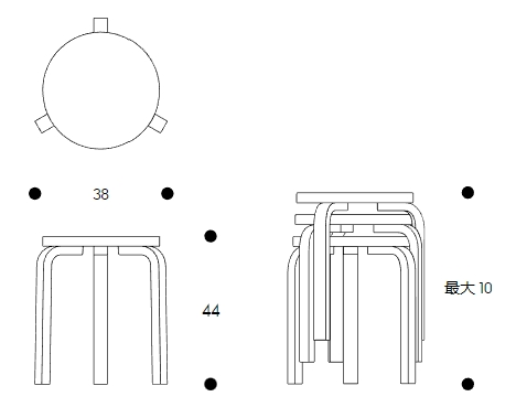 Alvar Aalto 标志性的凳子 60 是最元素的家具件,同样适合座椅、桌子、存储单元或显示表面。腿部直接安装在圆形座椅的下侧,无需复杂的连接元件。由于其几何形状,凳子可以堆叠,以节省空间在螺旋塔雕塑。Stool 60 在芬兰图尔库的 A 工厂生产 42 个生产步骤,有多种颜色和饰面可供选择。数百万台凳子60和它的四条腿的表弟,凳子E60,已经售出,使其成为设计史上最珍贵的产品之一。