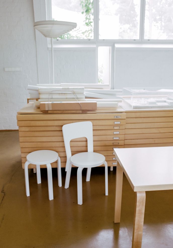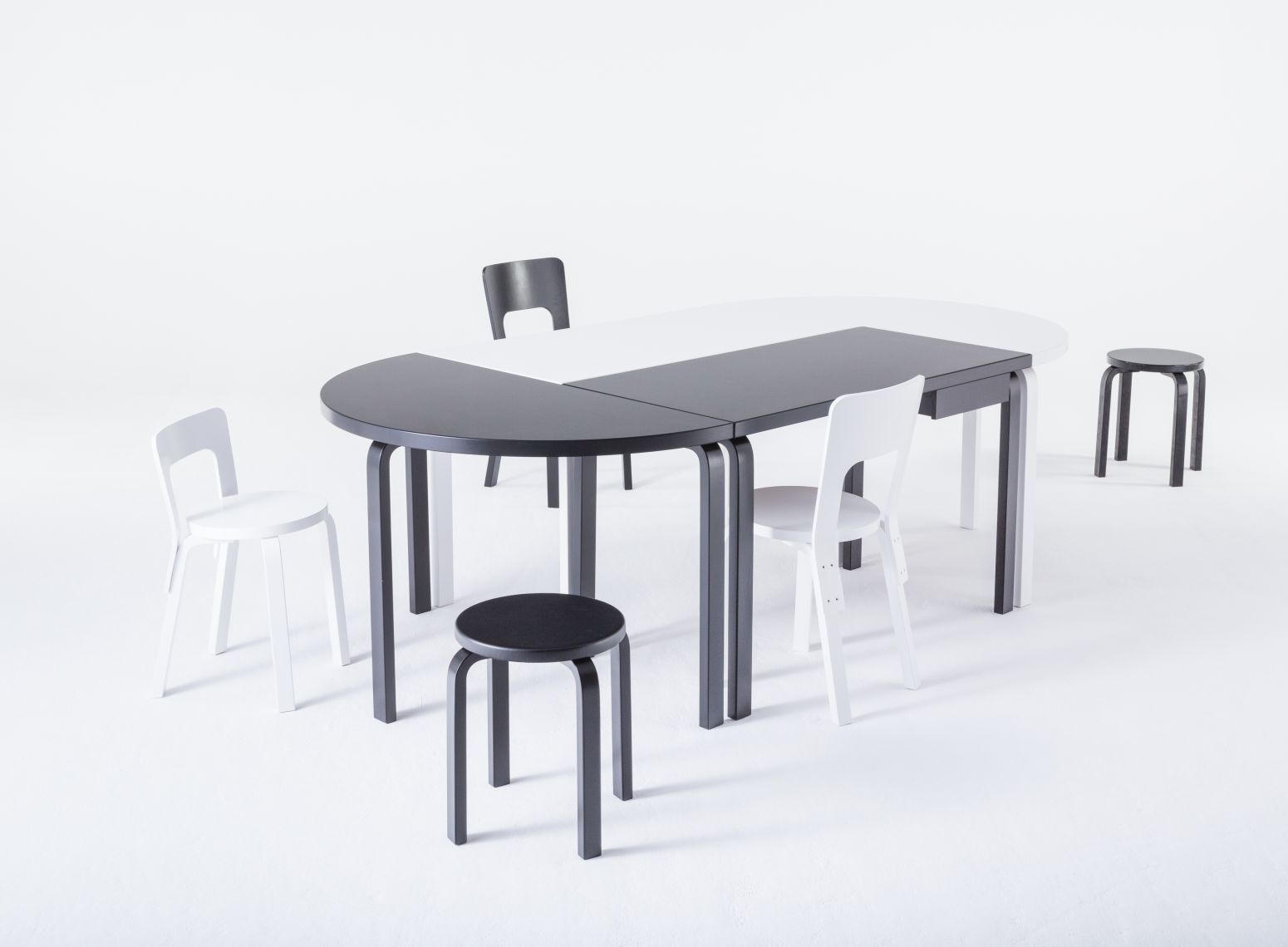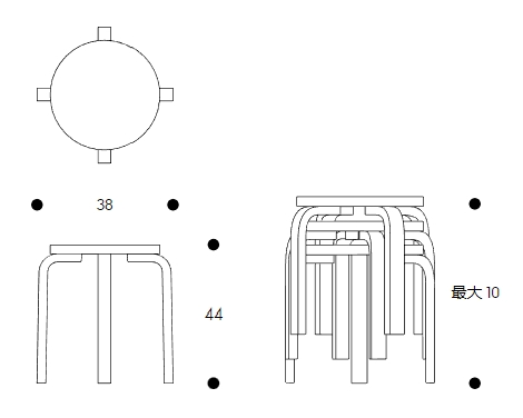 Alvar Aalto 的四条腿凳子 E60 是最元素的家具件,与座椅、桌子、存储单元或显示表面一样合适。凳子 E60 具有轻松的熟悉感,同样适合家庭、公共建筑和教育设施。腿部直接安装在圆形座椅的下侧,无需复杂的连接元件。由于其几何形状,凳子可以堆叠,以节省空间在螺旋塔雕塑。