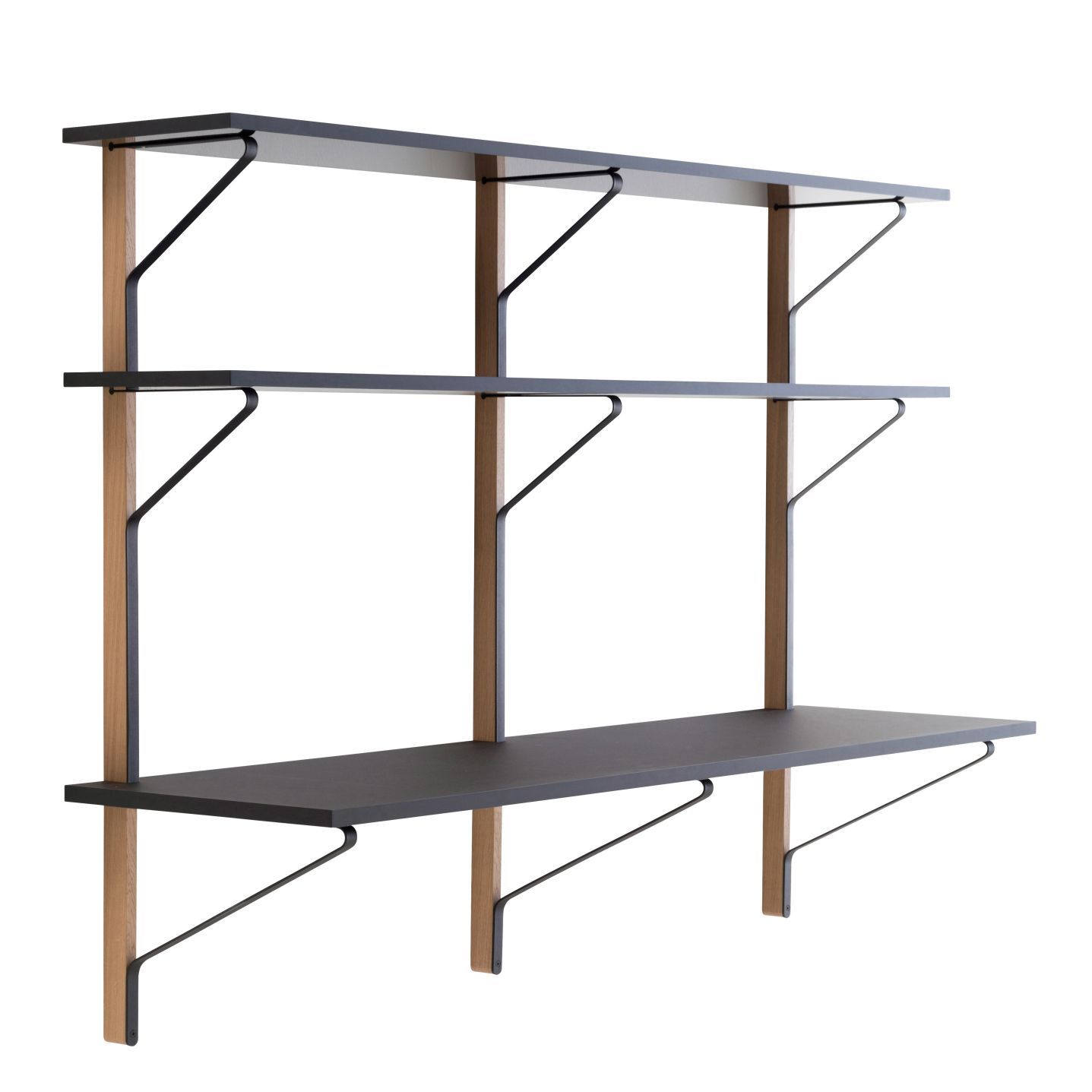 这些壁挂式搁板配有一张桌子,提供紧凑的家庭办公单元。将天然实心橡木墙支架与Kaari系列的简单弯曲钢带相结合,货架具有光滑的三聚氰胺表面,而书桌则以油毡完成,工作面舒适。增加的宽度为共同工作或分发文件、计划和文件提供了空间。