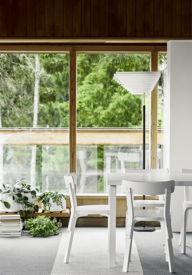 地板灯 A805 采用手工编织的阴影,由精致的漆金属条组成。它呈现了线条和曲线的惊人组合,同时允许直接和间接光的有趣相互作用。抛光黄铜领子与白色阴影形成鲜明对比,展台的黑色皮革饰面在芬兰手工缝制。不对称的形状让人想起天使的翅膀——因此这个绰号。"天使之翼"由阿尔瓦尔·阿尔托于1954年为赫尔辛基国家养老金研究所设计。
