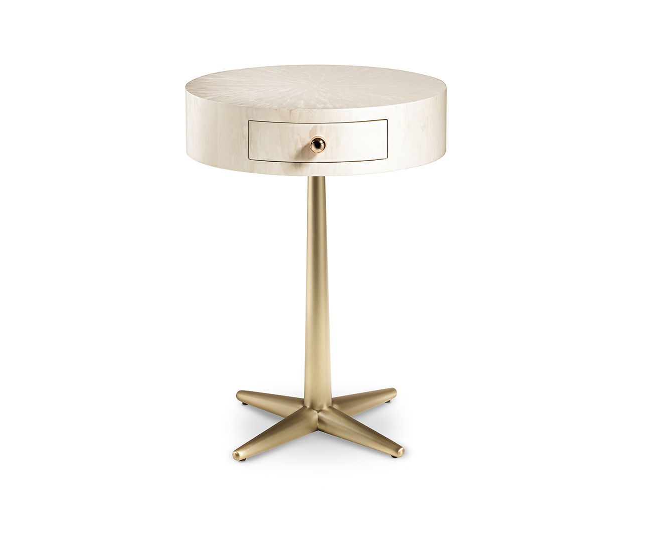 现代床头柜城市金属鼓与木制顶部。 中央脚由冷凝金属制成,在镀锌浴中完成,以黄铜或金色制成:顶部由手工装饰,抽屉内部覆盖着织物,配有一个金色旋钮。现代城市坦布里诺床头柜非常适合卧室或客厅作为沙发边桌。