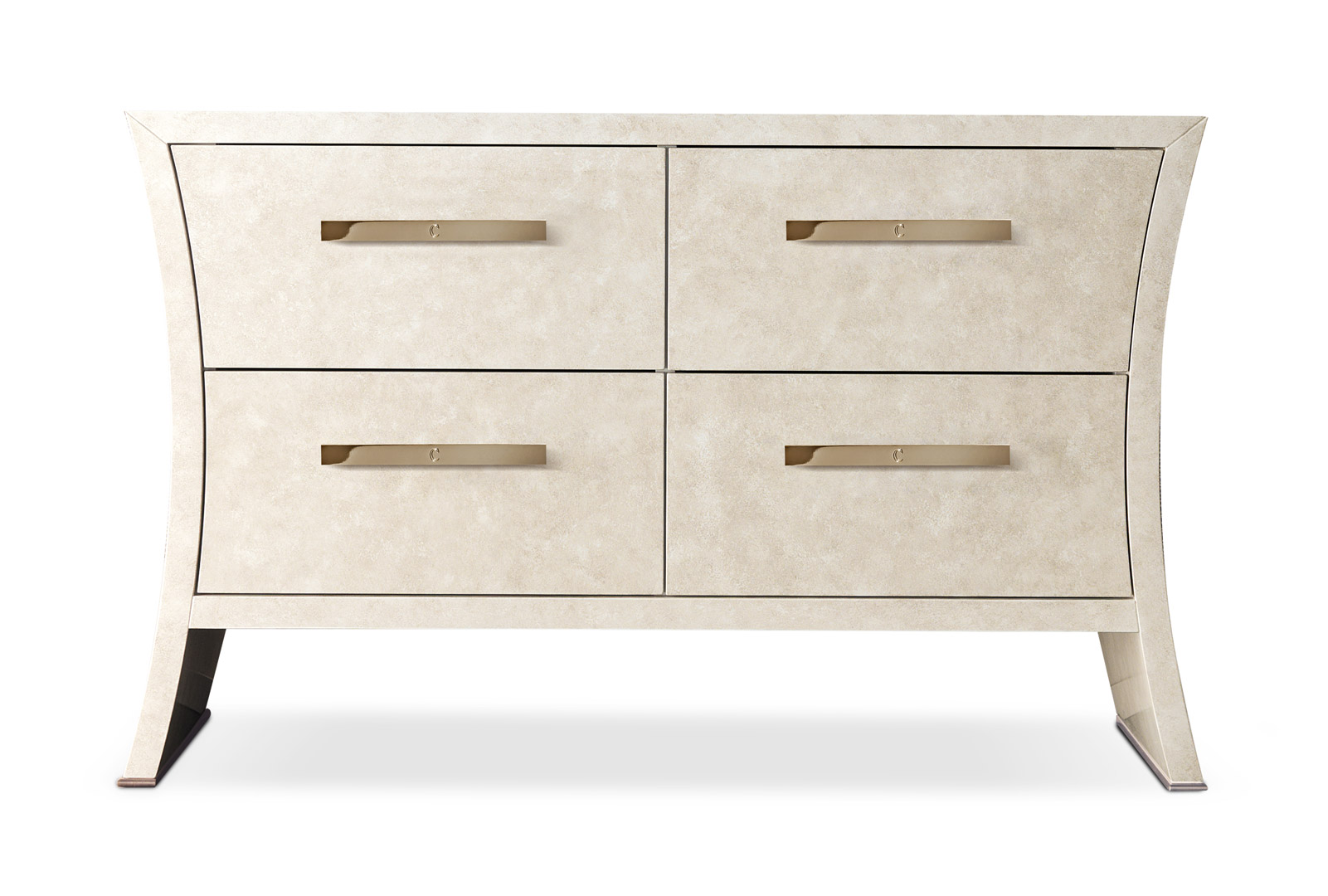 理查德新经典梳妆台/在装饰木材抽屉柜。 该结构以弯曲和形状的木材制成,由镶射的珍珠母或新的贝壳表面制成,为具有曲折形状的结构提供亮度。四个抽屉有浅金色的激光切割手柄:底座有青铜色。理查德新梳妆台,连同床头柜,创造了一个优雅和独特的夜景组。