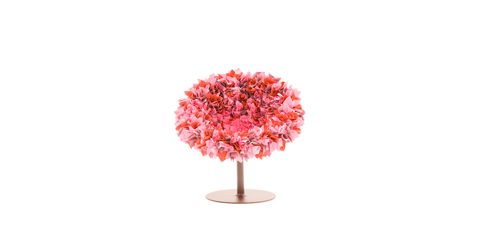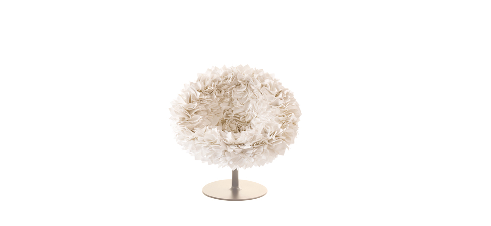 从薄薄的铬金属茎绽放出一束花瓣,由手工折叠的织物方块形成,并以娴熟的护理和无限的耐心逐一缝制。向美致敬,在重复的手势的简单性中触及精神层面,揭示视觉与真实形象之间的局限性。花瓣连衣裙以鸡蛋的形状包裹在壳体上,直到完全覆盖内侧。在工业设计的物质对象中,梦想的寓言,精致的诗意转换。扶手椅让坐在那里的人们开心,就像鲜花让接受花的人满意一样。