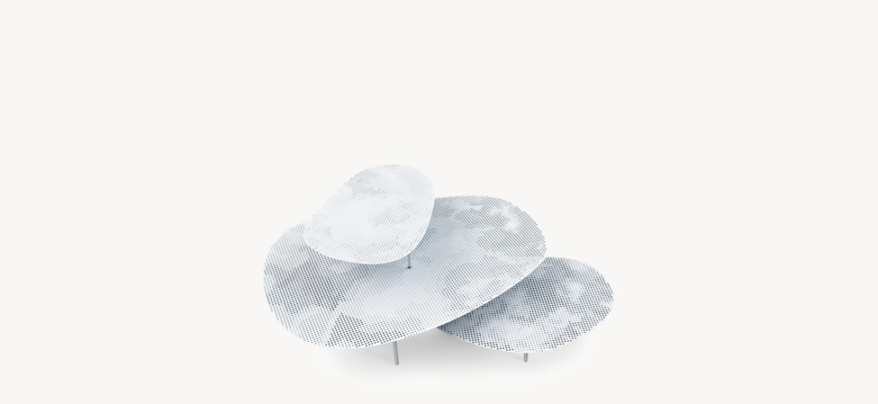 一套带穿孔钢顶的咖啡桌。粉末涂层和涂漆钢脚。聚丙烯鞋垫。
