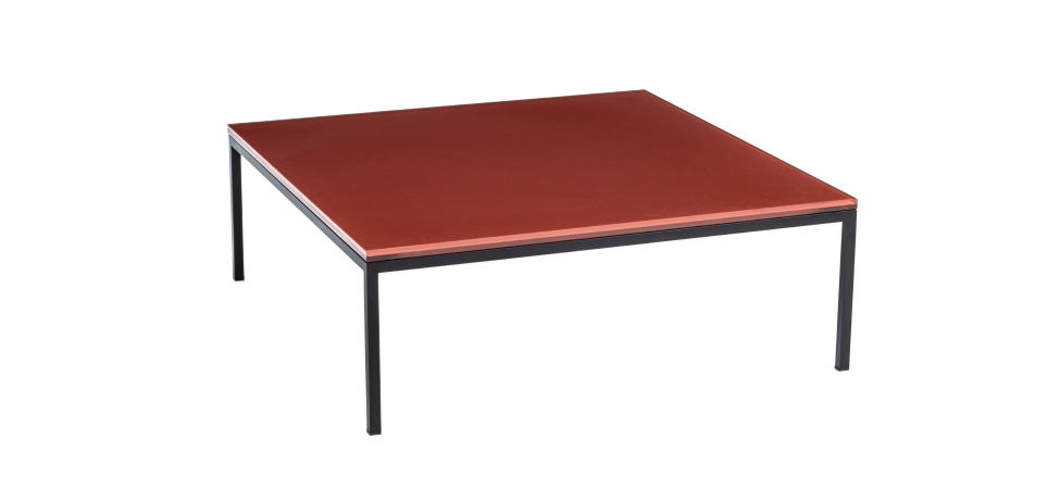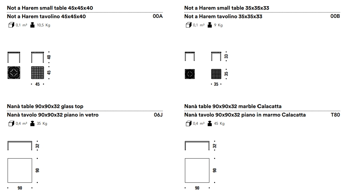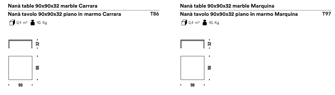 纳纳桌的大方形桌子有黑色金属底座,顶部有三个饰面的玻璃杯,或黑色马奎纳大理石、卡拉拉或卡拉卡塔。