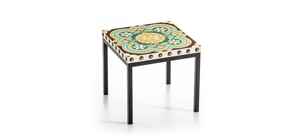 小桌子不是兔子的特点是黑色金属底座,由顶部超越,画布上印有摩尔瓷砖的设计。咖啡桌上装饰着抛光螺柱。