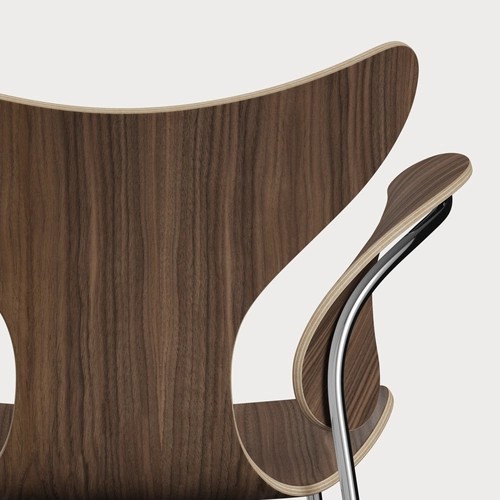阿恩·雅各布森首先为丹马克国家银行制作了时尚、弯曲的莉莉™椅。其独特的宽肩和纤细的腰部是雅各布森探索和挑战贴面的可能性,以创造完美的曲线,并提供最终的舒适性的惊人例子。百合3208有倾斜的扶手,突出了椅子的木纹,需要专业的工艺。这个模型是阿恩雅各布森的胶合板设计和木贴面实验的巅峰。