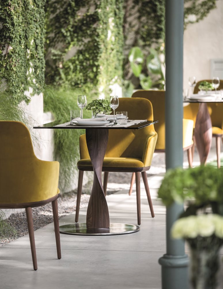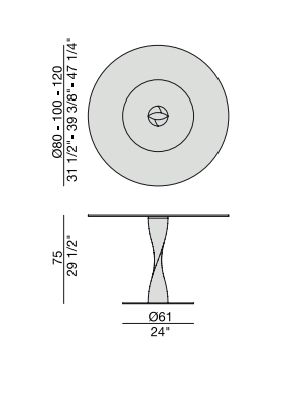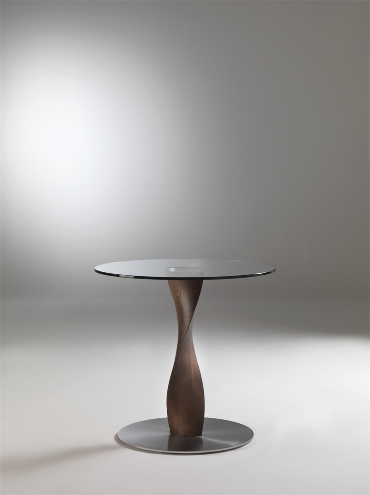 圆桌,底座为实心卡纳莱塔核桃或灰烬,安装在金属环和钢化玻璃顶部(厚度毫米12)。