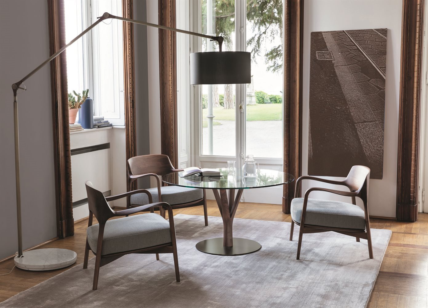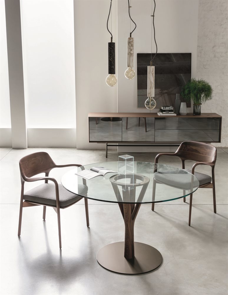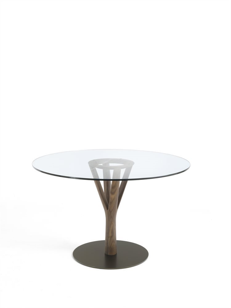 圆桌,中央茎在固体运河核桃安装在青铜完成金属板和钢化玻璃顶部(厚度毫米.12)与不锈钢板与紫外线粘合。