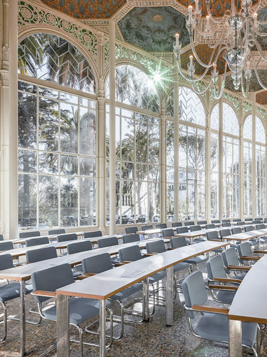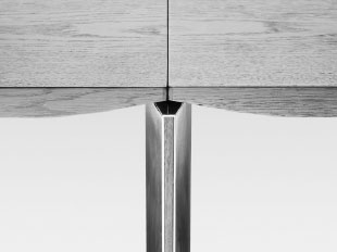 安装在桌面外缘的腿以其高贵的落差形状给人留下深刻印象,并呈现向外倾斜的细长边缘。