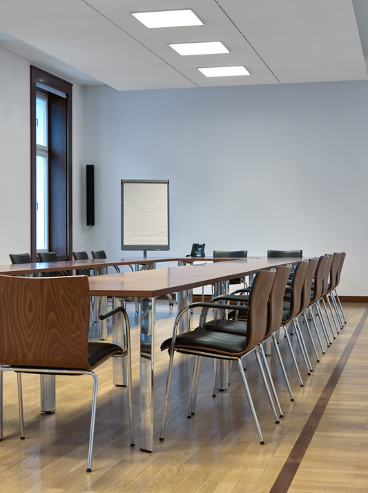 可以插入木材、皮革或其他材料,为餐桌系统提供符合任何会议或培训区域的视觉条件的个人外观。现代和优雅的弯曲:T腿