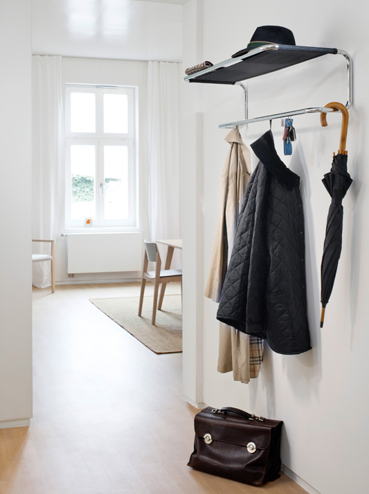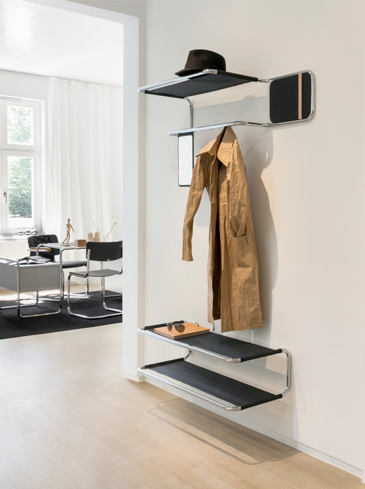 Thonet 管状钢大衣架 S 1520 的灵感来自 1930/31 年经典管状钢壁挂式外套架 B 52/1,该衣架记录在 1930/31 年著名的 Thonet 目录中。与历史设计相比,尺寸经过了精心调整,符合现代要求 - S 1520 为服装和物品提供了更大的空间。覆盖的衣钩使线性,更清洁的外观。帽子、包和鞋子的货架由耐用的半透明网制成。两个衣架和货架版本构成了入口区域的完整产品系列。其单个模块可以完美结合,并非常适合所有其他的Th奥奈管状钢经典。