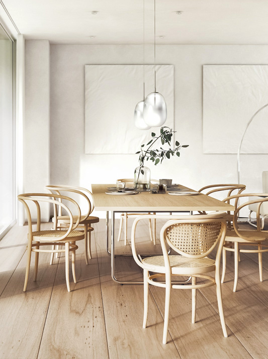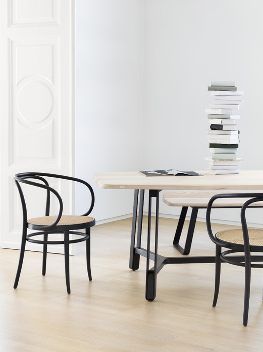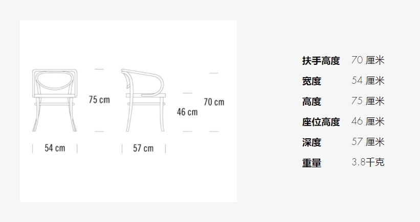 这个优雅的弯曲木经典是其建设和生产的杰作:投影框架,形成背背和扶手弯曲成它的形式从一块实心山毛虫木材。像所有弯曲木椅的原始模型一样,214号椅子、209号椅子也只由六个部分组成。由于它的审美减少与有机形式相结合,它几乎看起来像一个雕塑。瑞士建筑师勒·科布西耶着迷于它,并把它用于他的许多建筑,例如1927年在斯图加特的魏森霍夫庄园。他曾经说过这把椅子"具有贵族性"。