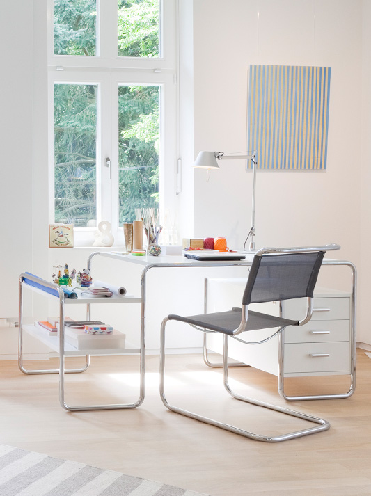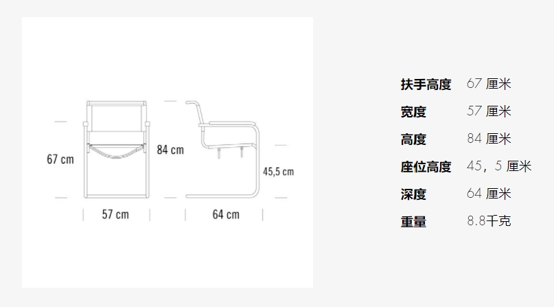 立方形、清晰的设计、精细的比例和弯曲的运动:完美的悬臂椅S 33和S34的开发,在当今同类中首创,结合了时代精神和传统感。艺术家库尔特·施维特斯在1927年看到家具史上第一把悬臂椅后写道:"如果两条腿足够的话,为什么四条腿就够了?S 33 和 S 34 两把椅子在斯图加特魏森霍夫庄园的韦克本德展览上引起了轰动。从1925年开始,Mart Stam试验了小直径的煤气管道,起初他用水管工使用的标准管道配件连接起来。作为进一步发展,Stam 创造了不再四条腿站立的悬臂椅,它是一种建筑原则,在现代家具设计史上以其形式约束成为重要的建筑块。他的悬臂椅S33和S34是非事实设计的室内设计对象:他们是建筑和生活新态度的整体革命概念的一部分。