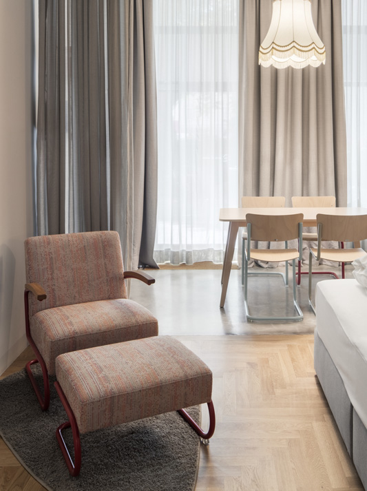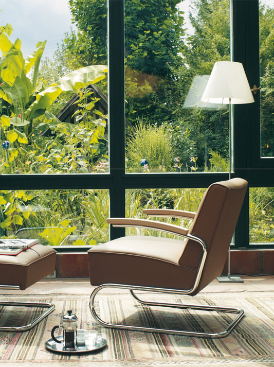 这款扶手椅的突出特点是优雅、永恒和卓越的座椅舒适性。除此之外,还有一种只有悬臂模型才能具有的轻盈度。虽然20世纪20年代的第一把管状钢椅很少进行软垫,但1935年Thannet目录展示了一整套装饰巨大的扶手椅和沙发。1932 年的内部 Thonet 设计 S 411 可能标志着这一新产品系列的开始。如今,它以高品质的室内装潢生产。还提供匹配的脚凳。