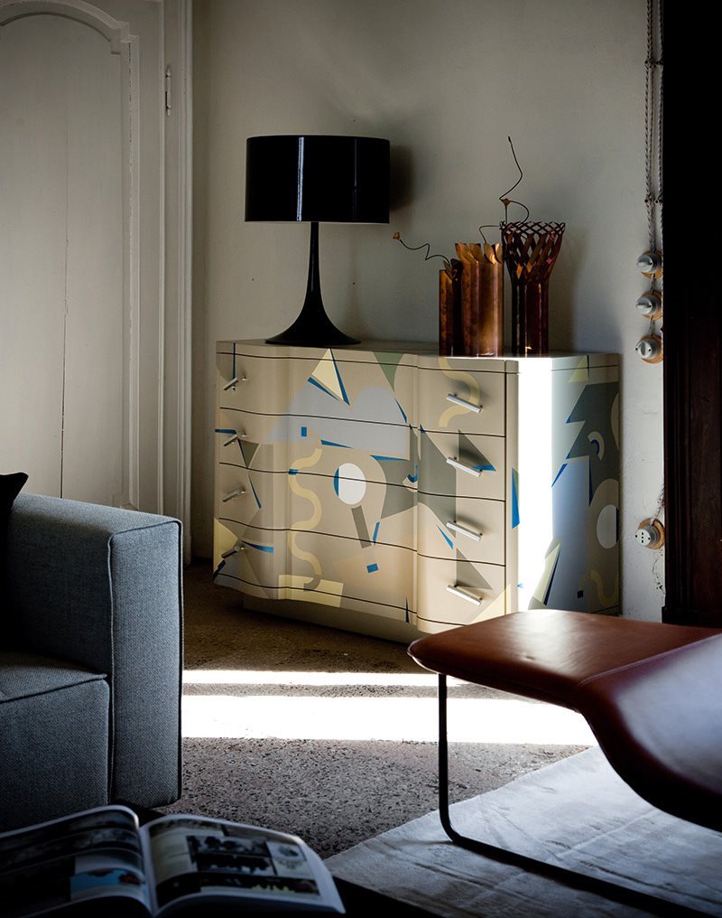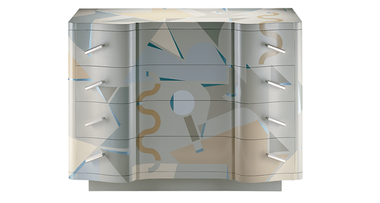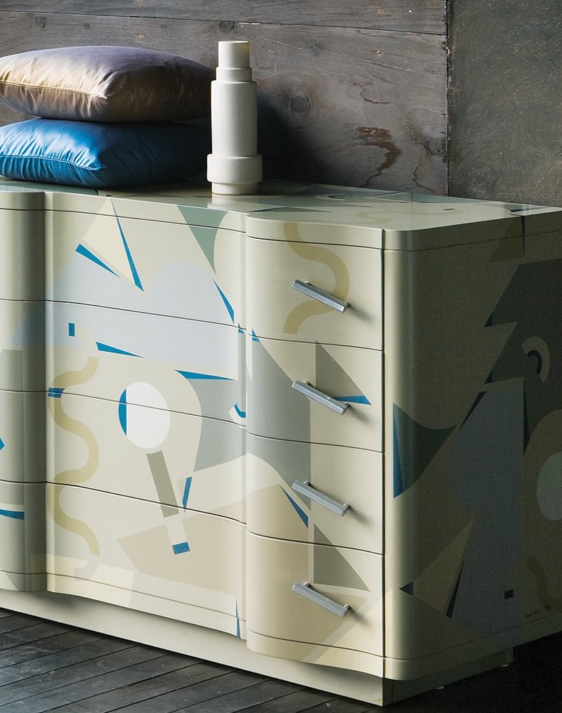 抽屉柜。署名原创作品。清漆木框结构,饰以彩色手绘。本色氧化铝把手。抽屉内饰选用灰色清漆木料。