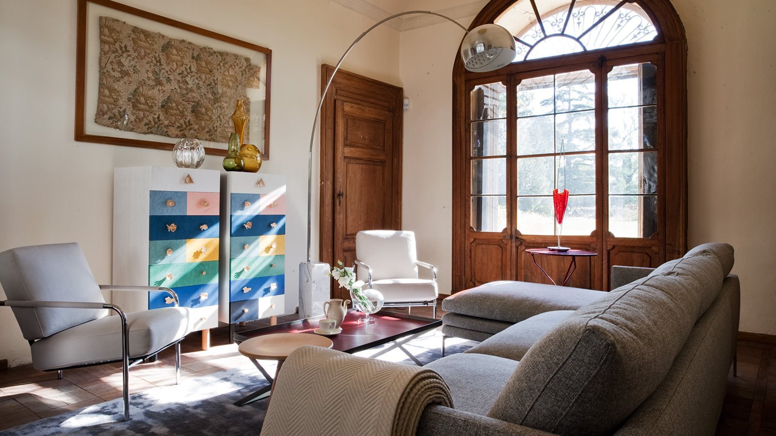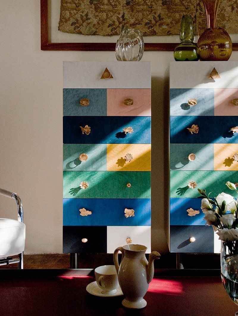 抽屉柜。署名原创作品。木框结构,多色野蔷薇贴面。铸造青铜把手,象征圣经《创世记》。