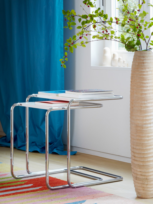 优雅、灵活,适合各种用途。在尺寸上,表集B 97让人想起马塞尔·布劳尔的筑巢表B 9。然而,它改变的结构提供了一个实际的优势:由于一侧的开口,桌子可以拉过沙发、扶手椅或床边。它们也可以方便地相互推入。1933 年 Thonet 设计是管状钢制家具的经典之一。